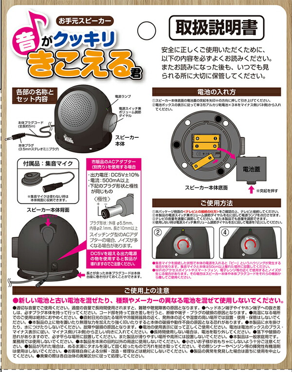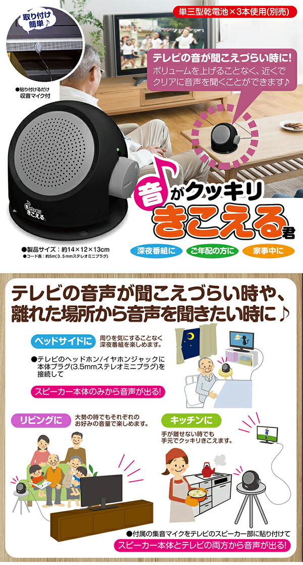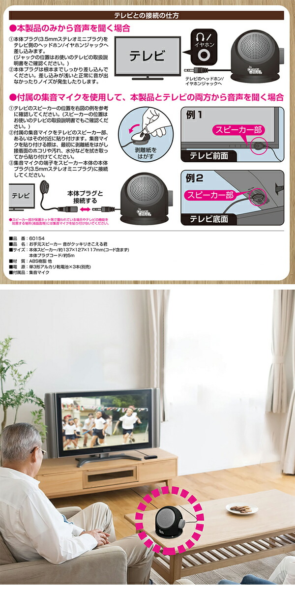*おじいちゃん・おばあちゃんの家のテレビの音量、大きい時ありませんか? マイクをテレビのスピーカー部に張り付けてるだけでテレビ・手元のスピーカーの 両方から音声が出ます! 食事中、自分だけ音が聞こえにくいけど周りに合わせて聞こえない音量で テレビ観ていませんか? *便利な2種類の接続方法を選べますので、お好みの音量で家族と一緒に テレビを楽しめます。 マイク使用時:付属の集音マイクを使用した場合、テレビと手もとスピーカーの 両方から音声を出せます。 *キッチンから離れたテレビの音声も手元ではっきり聞こえます! *自分だけ音声調整を大きくすることができ、周りに迷惑をかけません。 端子接続時:本体コードをテレビのヘッドホン端子に接続した場合、スピーカー だけから音声を出せます。 *隣を気にせずに深夜番組などを愉しめます。 *ケーブル、マイク収納付! 余ったケーブルは巻き取って収納できますので、スッキリ使用できます。
