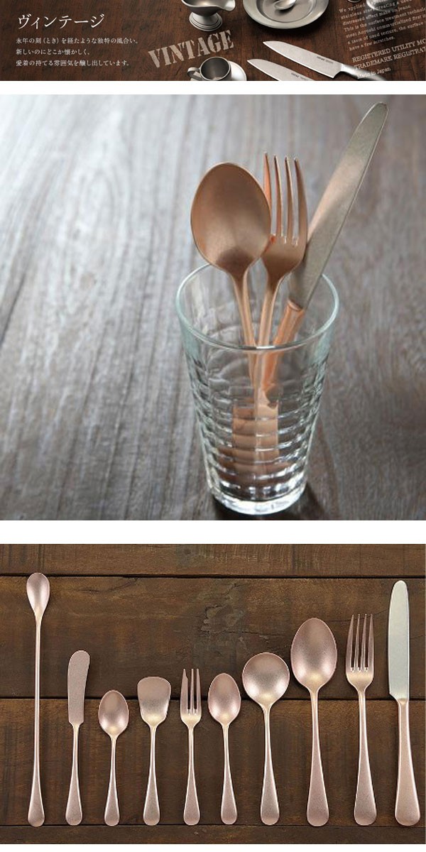 ●シンプルで滑らかなカーブが特徴のオールドイングリッシュシリーズです。 ●表面にヴィンテージ加工を施し、ピンクゴールドメッキで仕上げました。 ●普段使いだけでなく、おもてなしにも十分対応できる高品質なカトラリーシリーズです。 ●ヴンテージの風合いとして、表面に凹凸及び傷があります。
