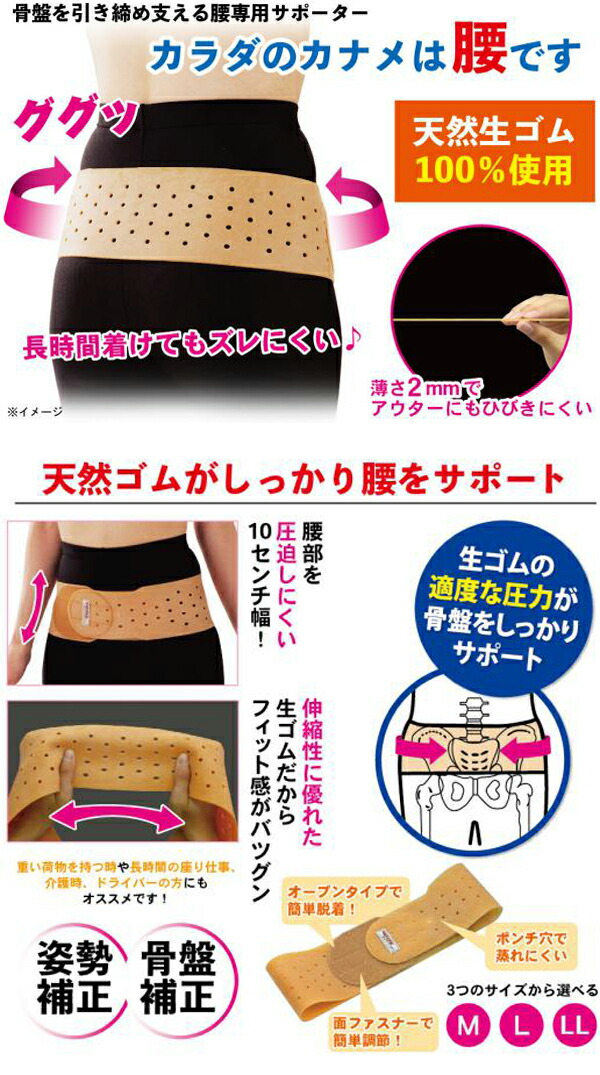 ◆本品は天然ゴムを使用し、適度な強さで伸縮を保ち、腰部を軟らかく保護します。 ◆天然生ゴム100%使用!長時間着けてもズレにくい。 ◆10cmの細巾カットで腰骨に当たるように使用するので腹部の圧迫感はありません。 ◆スポーツ・レジャー、重い荷物の運搬に、長時間の座り仕事に、看護・介護に ドライバーにお奨めです。 ◆サイズはM、L、LLがあります。