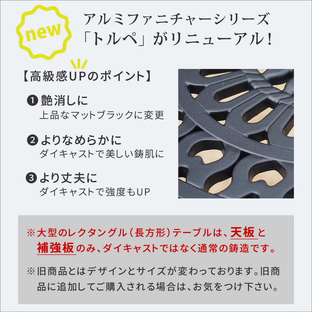 ※大型のレクタングル(長方形)テーブルは、天板と補強板のみ、ダイキャストではなく通常の鋳造です。
