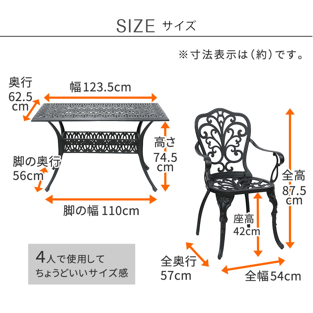 ガーデンテーブル チェア4P 5点セット 長方形 120 レクタンテーブル おしゃれ クラシック トルペ 黒 マットブラック アルミ 庭 鋳物 軽量 高級感 BKS-RG124-5PS