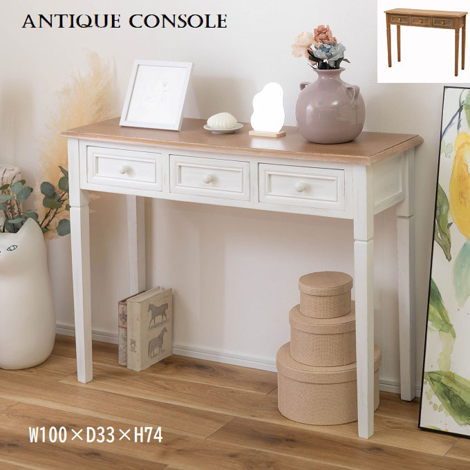 コンソール テーブル デスク 飾り台 おしゃれ 北欧 幅100 ブラウン ホワイト 引き出し3杯 クラシック シャビーシック フレンチ カントリー アンティーク