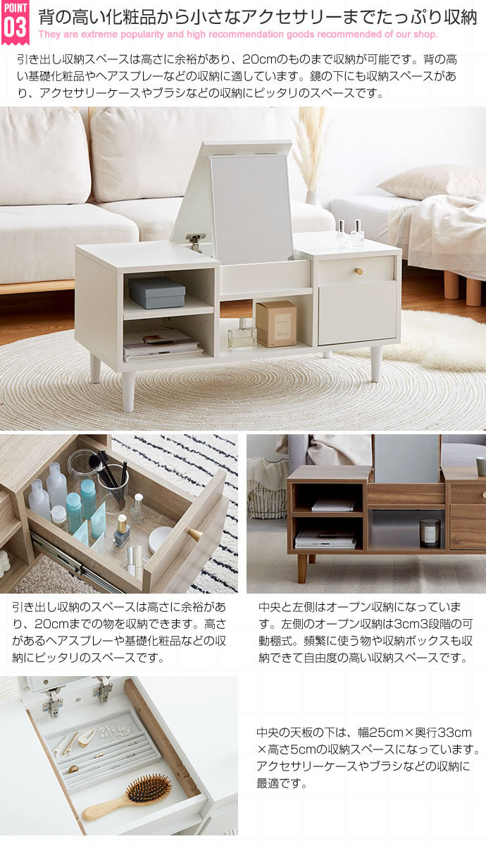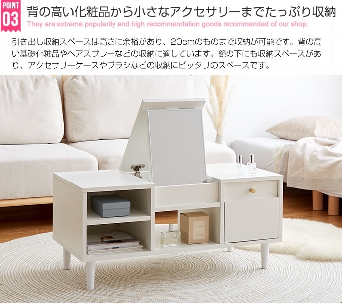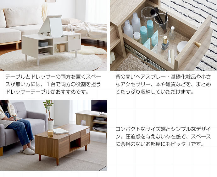 ドレッサーにもセンターテーブルにも作業台にもなる便利な1台で収納力もたっぷり♪おしゃれな3色から選べます