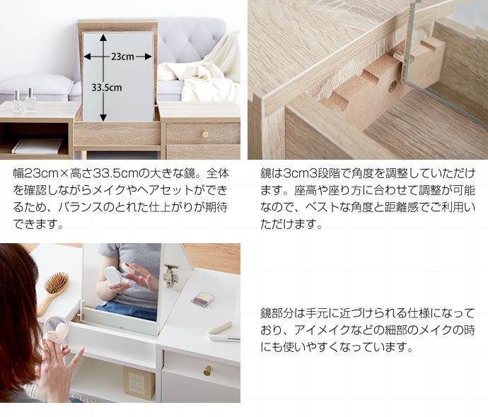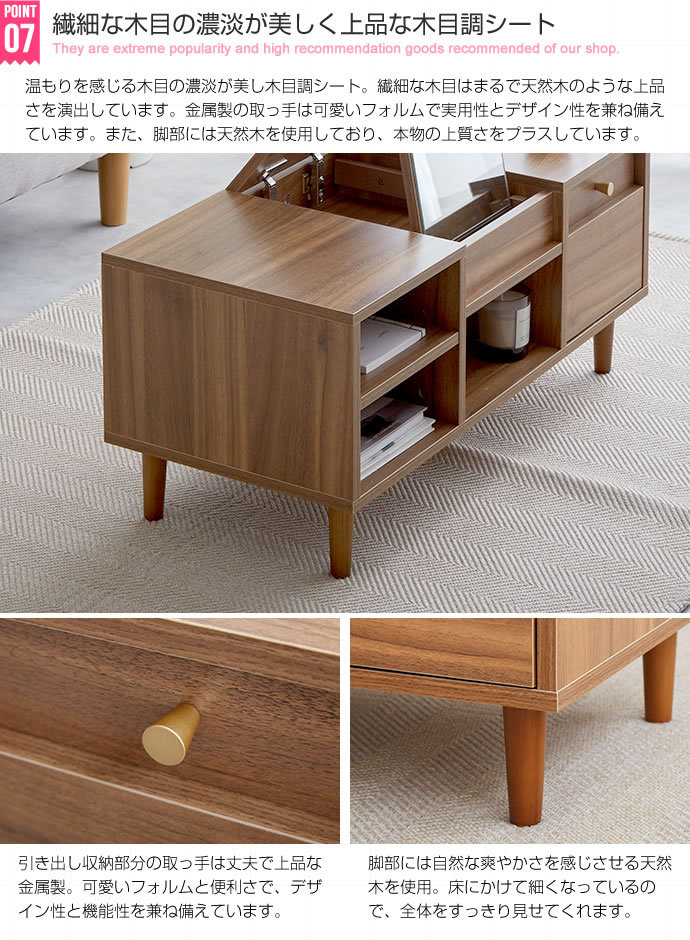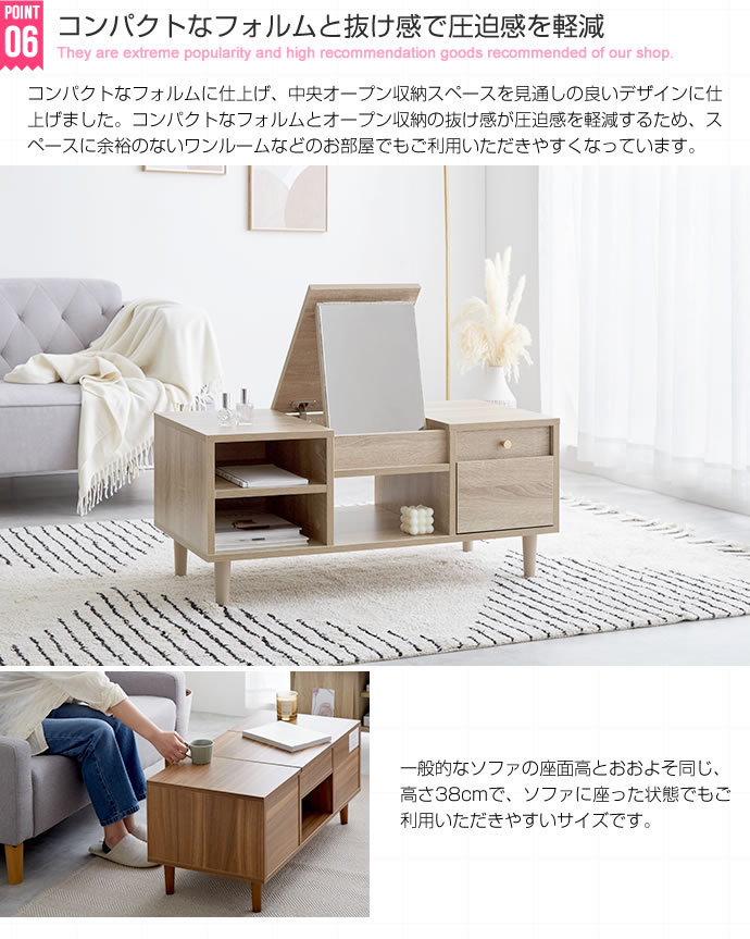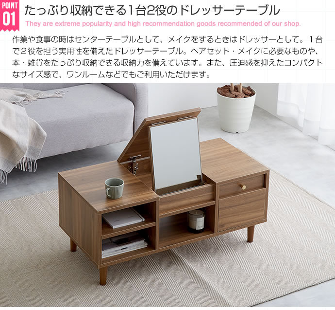 開閉式ミラーでドレッサーにも、ローデスクにも、センターテーブルにもなる一台三役の便利なローデスクドレッサー。