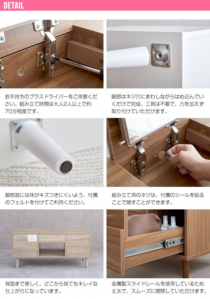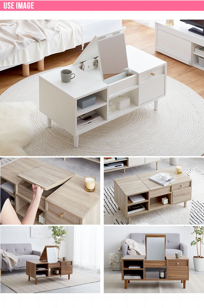 リビングの真ん中に置けば、メイク、食事、デスクワークなど1台で色々な用途で活躍します。