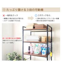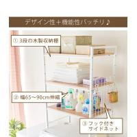 横幅65〜90cmの伸縮タイプでお家の洗濯機に合わせて設置が可能です。三段の可動棚でたっぷり収納!サイドはちょい掛けに便利なネット仕様で、フック2個付き。