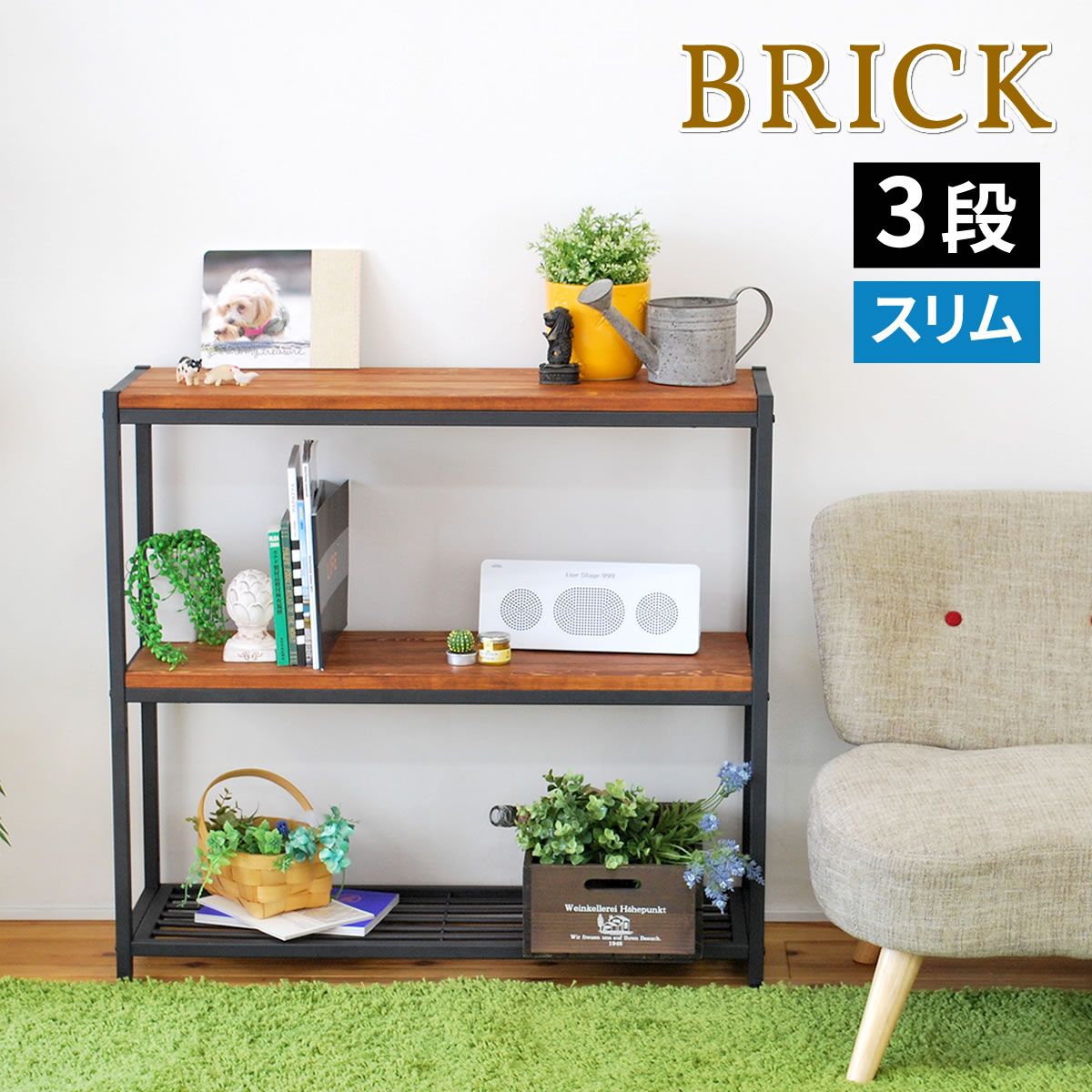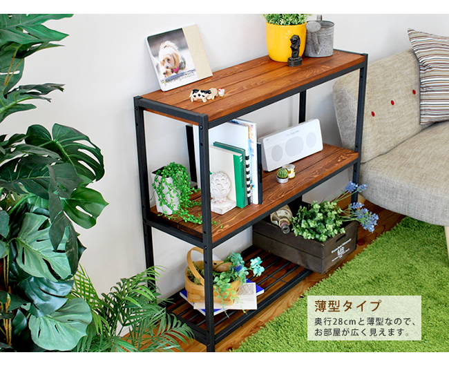オープンラック 棚 シェルフ スリム 3段 おしゃれ ビンテージ風 天然木 86×28×81 BRICK ブリック PR-860SL-3BRN ブラウン×ブラック 本棚