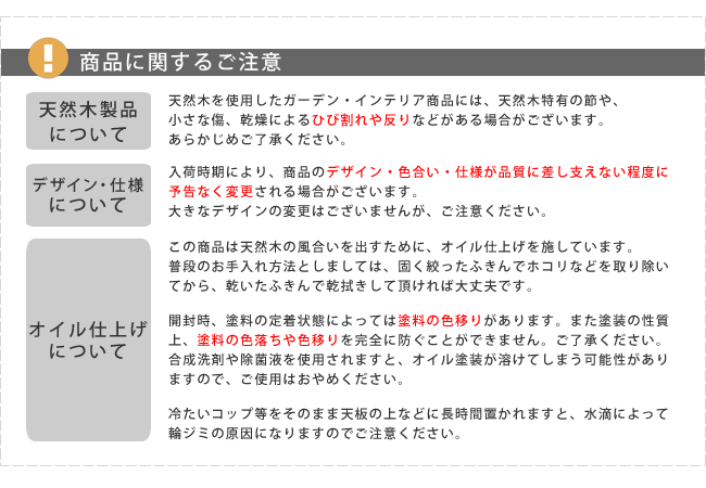 | ■備考 | ※天然木のため、節や、乾燥による割れが発生する場合があります。強度に問題はありませんので、安心してご使用ください。 ※入荷時期により、商品のデザイン・色合い・仕様が品質に差し支えない程度に予告なく変更される場合がございます。大きなデザインの変更はございませんが、ご注意ください。 |