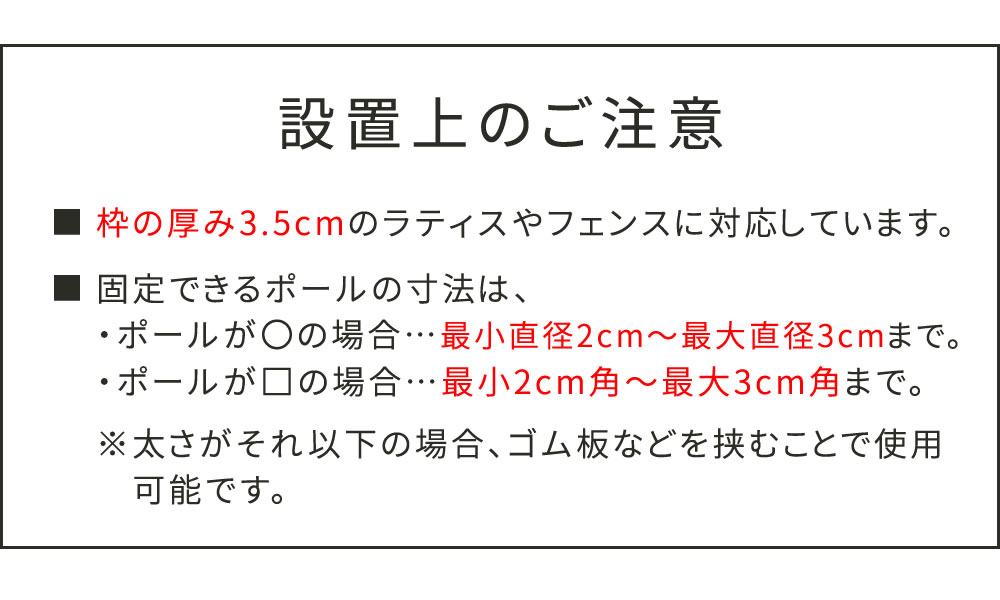 ※枠の厚み3.5cmのラティスやフェンスに対応しています。