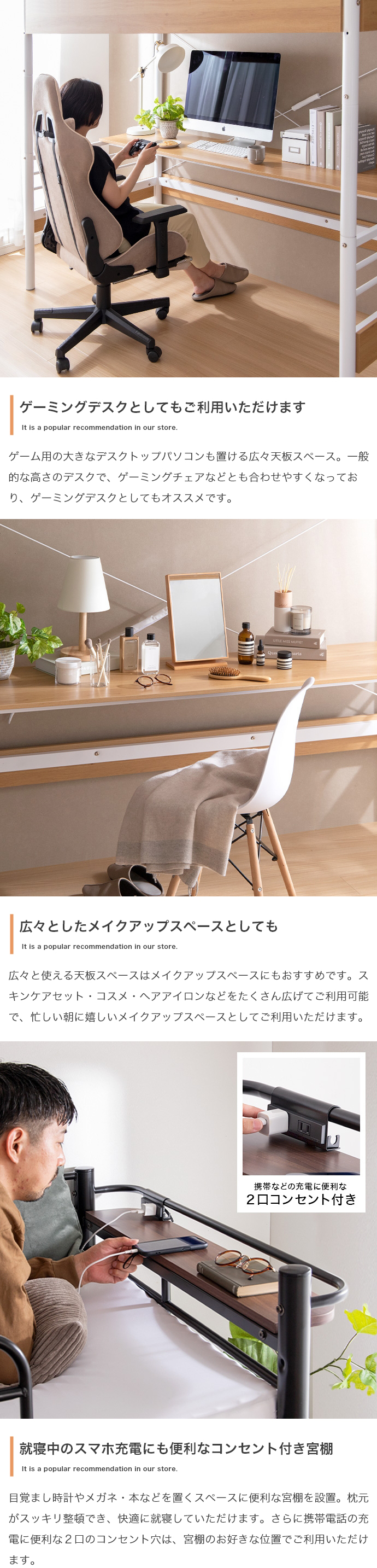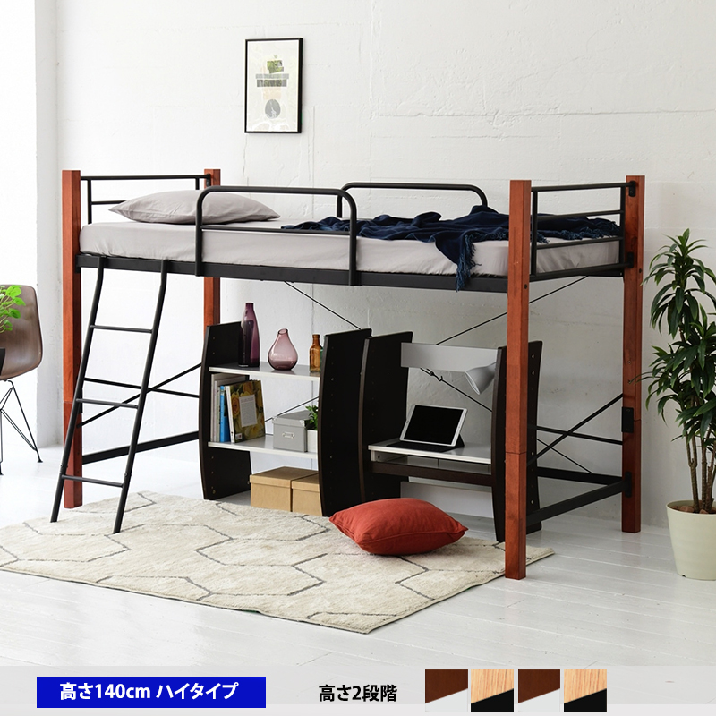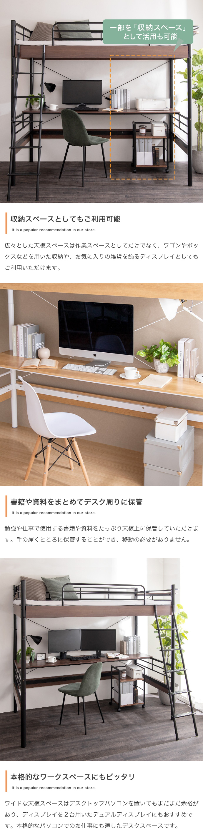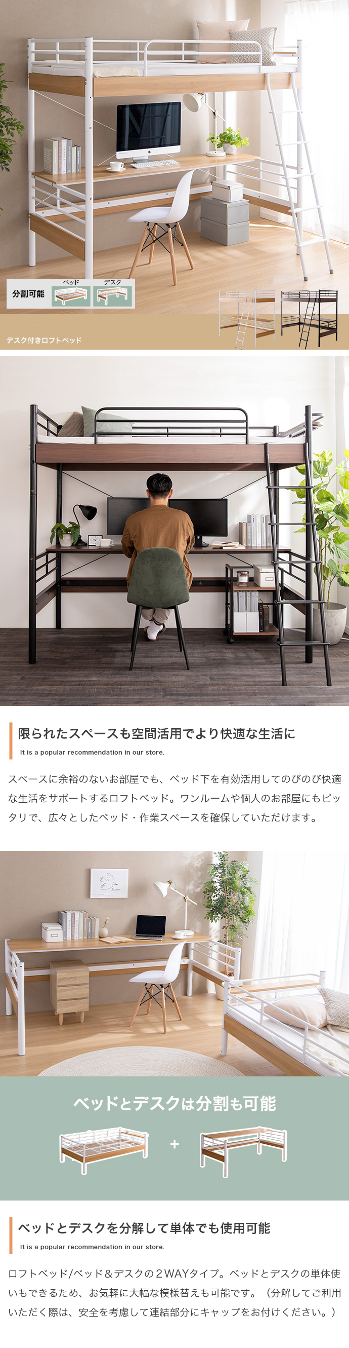 限られた空間で広々としたデスクとベッドを確保するロフトベッド、ワンルームや個人のお部屋などのスペースに余裕が無いお部屋にピッタリです。