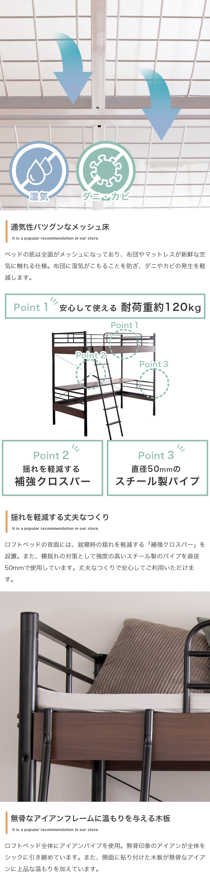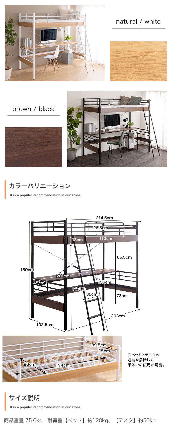 【耐荷重】ベッド:約120kg、デスク:約50kg