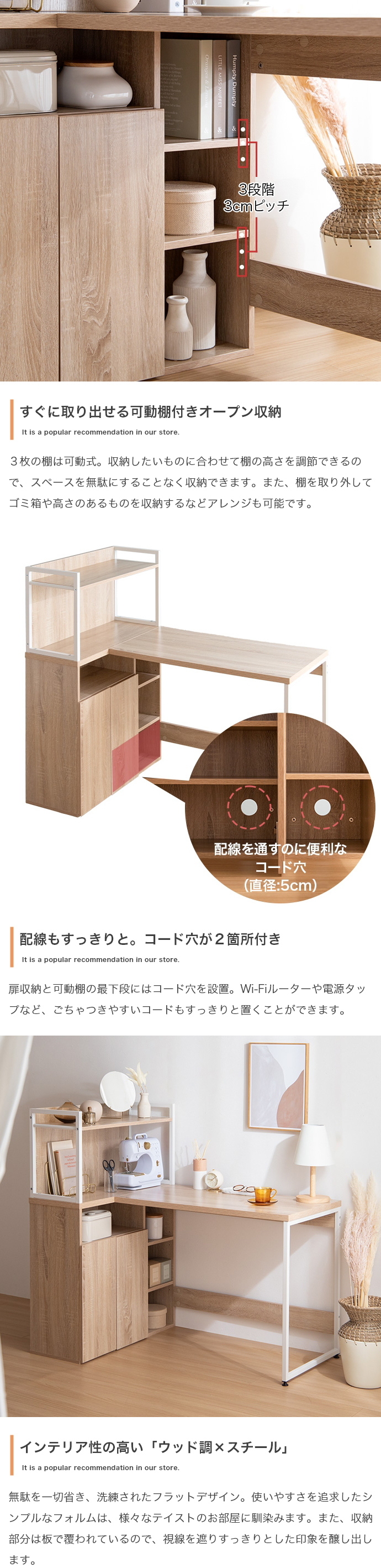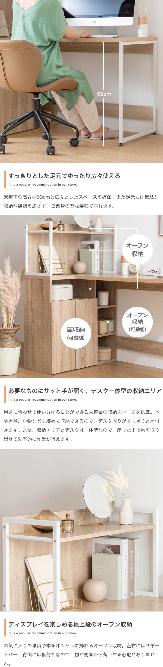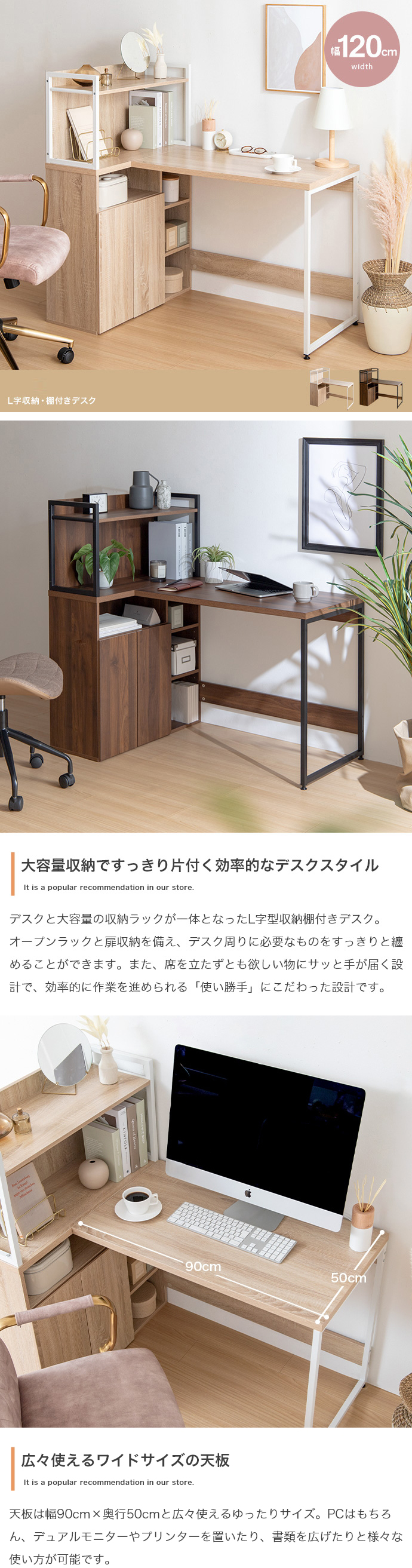 大容量収納でデスク周りがすっきり片付く、収納とデスク一体型のL字収納・棚付きデスク