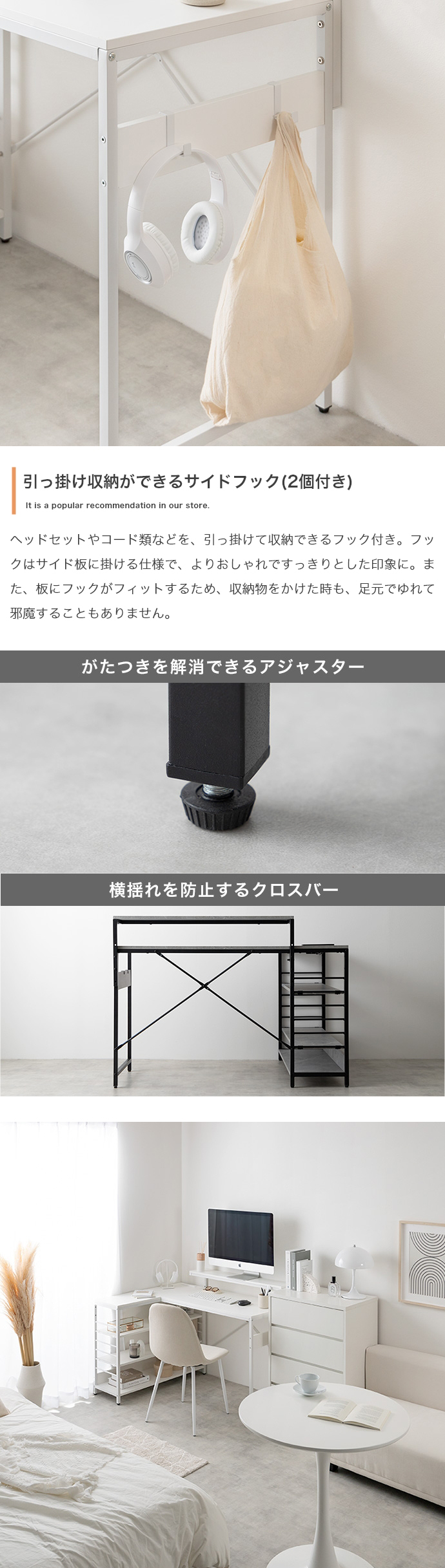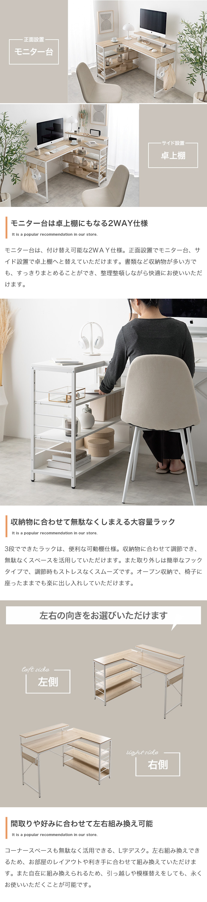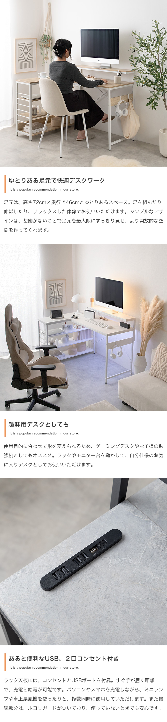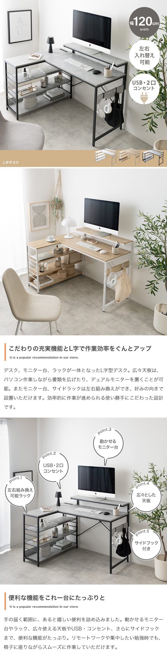 モニター台、ラックは左右組み換えでき、好みの向きに合わせてご使用いただけます。また、嬉しいUSB・コンセント付き