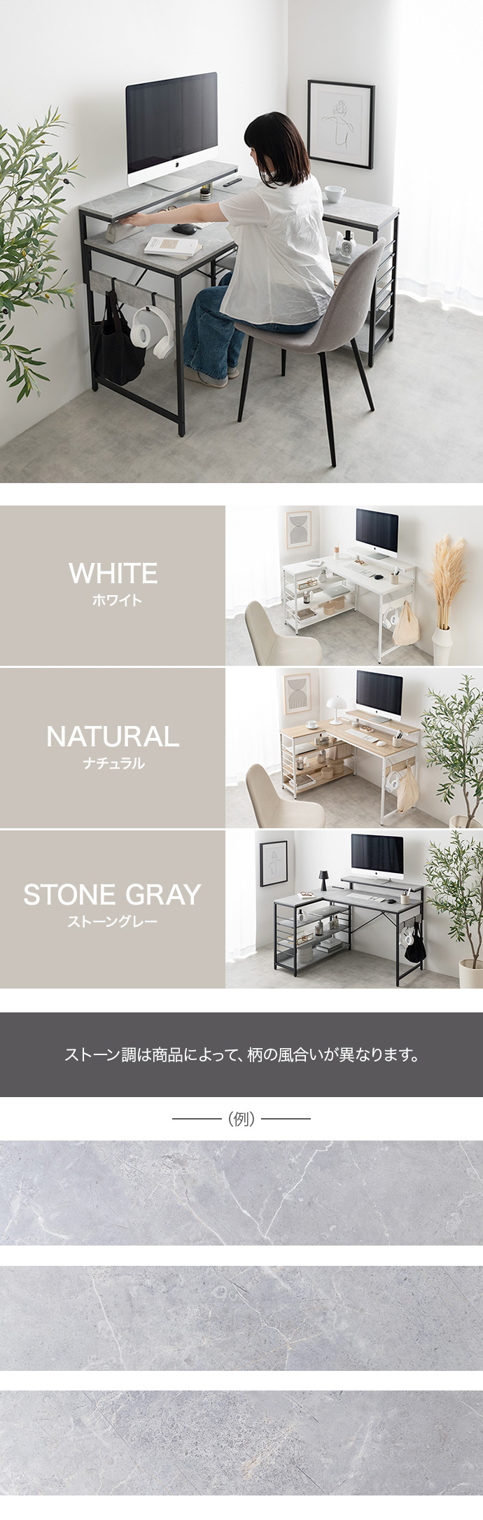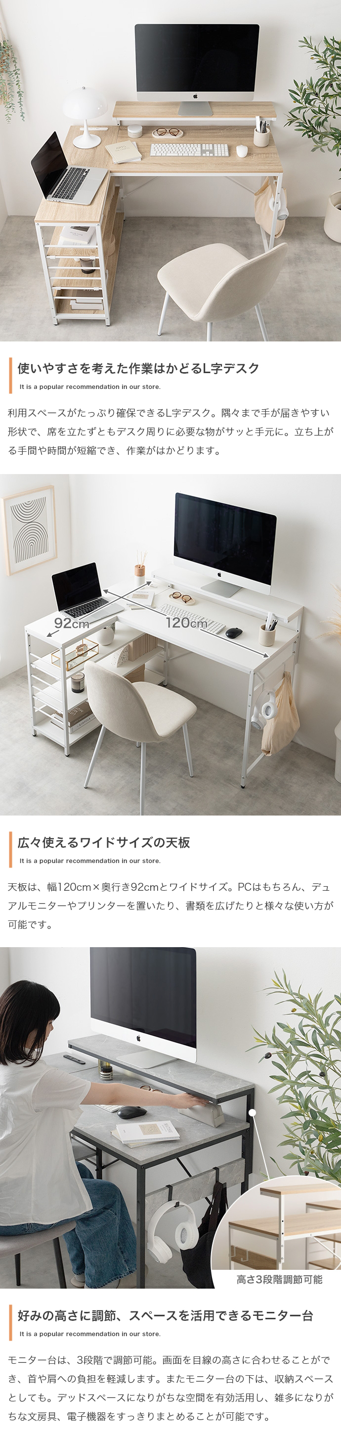 デスク、モニター台、ラックが一体となったL字型デスク