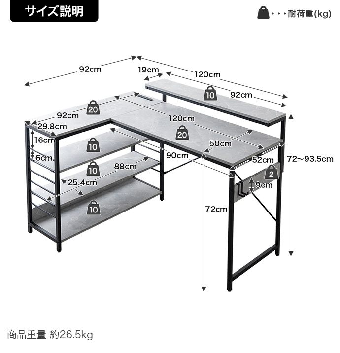 幅120cm×奥行き92cm×高さ72-93.5cm