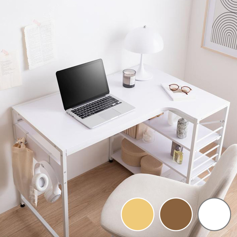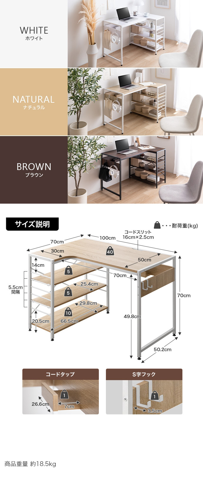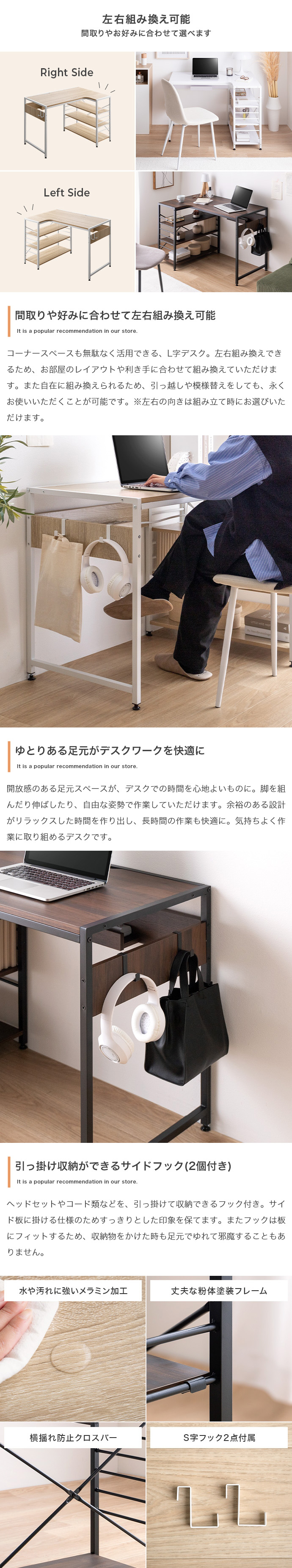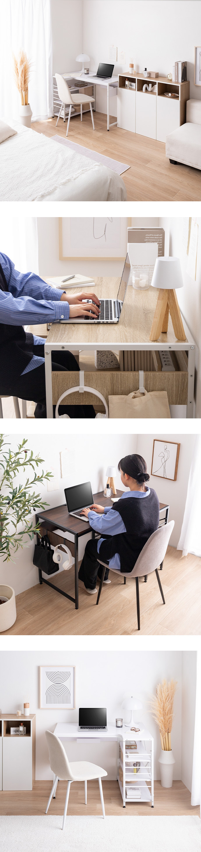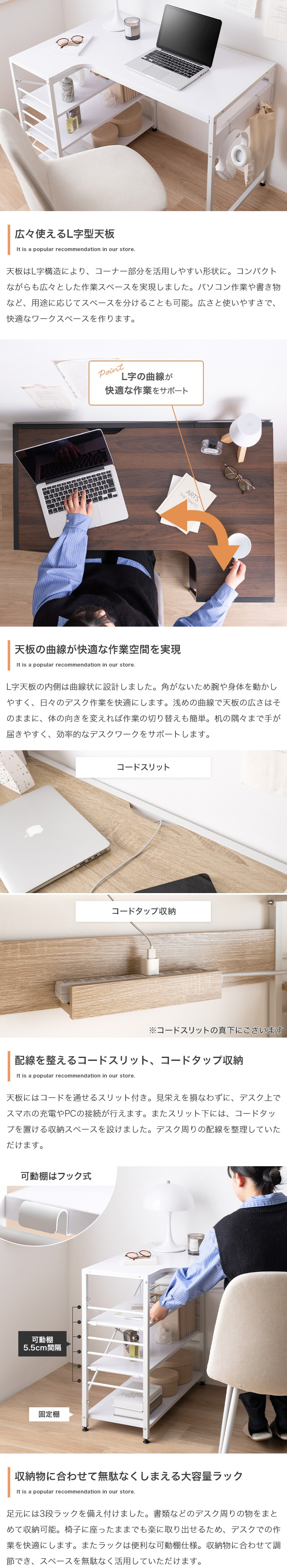 天板内側は曲線上にすることで、腕や体を動かしやすい設計に。また可動棚付きのサイドラックやコードタップ収納、S字フックが付属しており、日々のデスクワークを快適にするこだわりの詰まったデスクです。