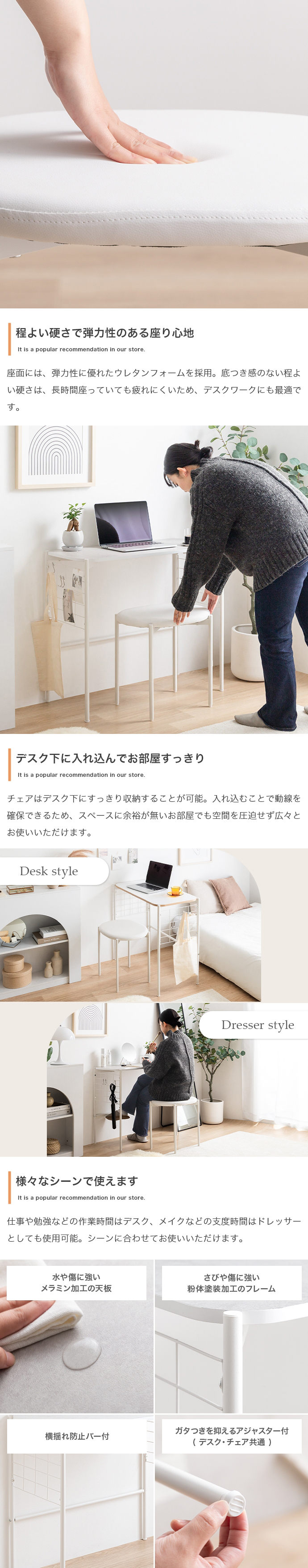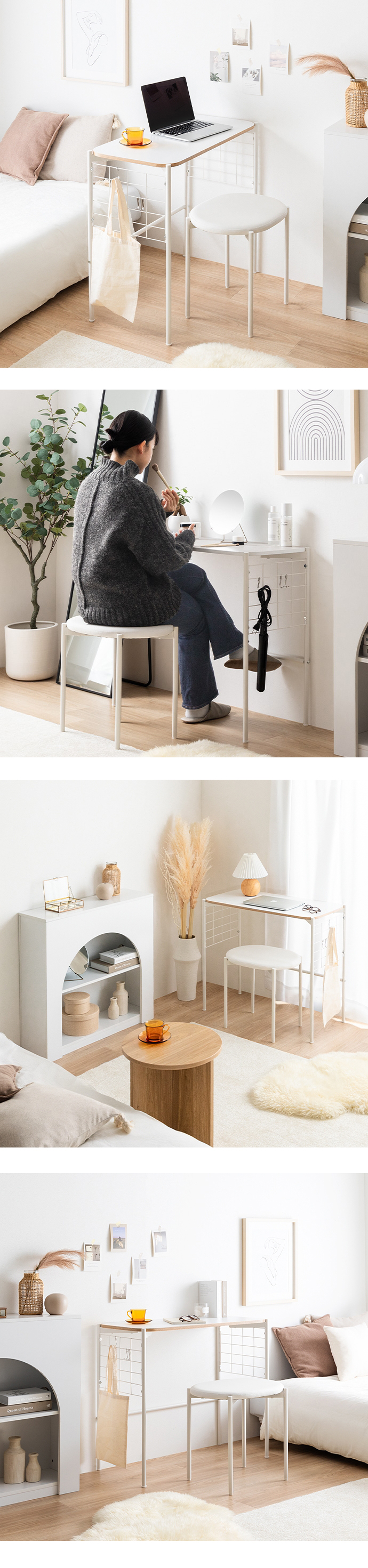 限られたスペースでも使いやすいコンパクト設計のため、ワンルームや一人暮らしのお部屋にもおすすめです。また作業時間はデスクとして、支度時間はドレッサーとしても使用ができ、シーンに合わせてお使いいただけます。