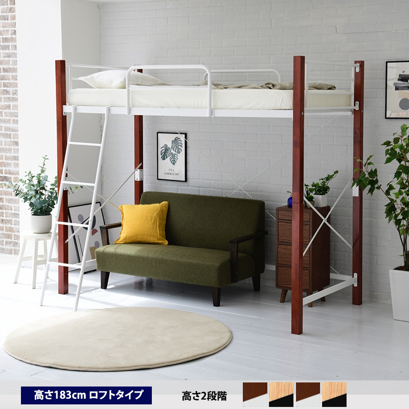 ロフトベッド 高さ183cm 4色 天然木 高め ハイタイプ シングル パイプ システムベッド 本体のみ 耐荷重120kg スチールベッド 高さ調節