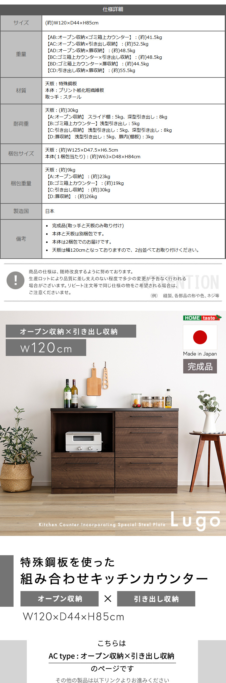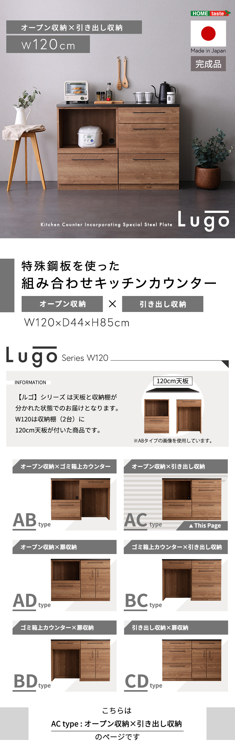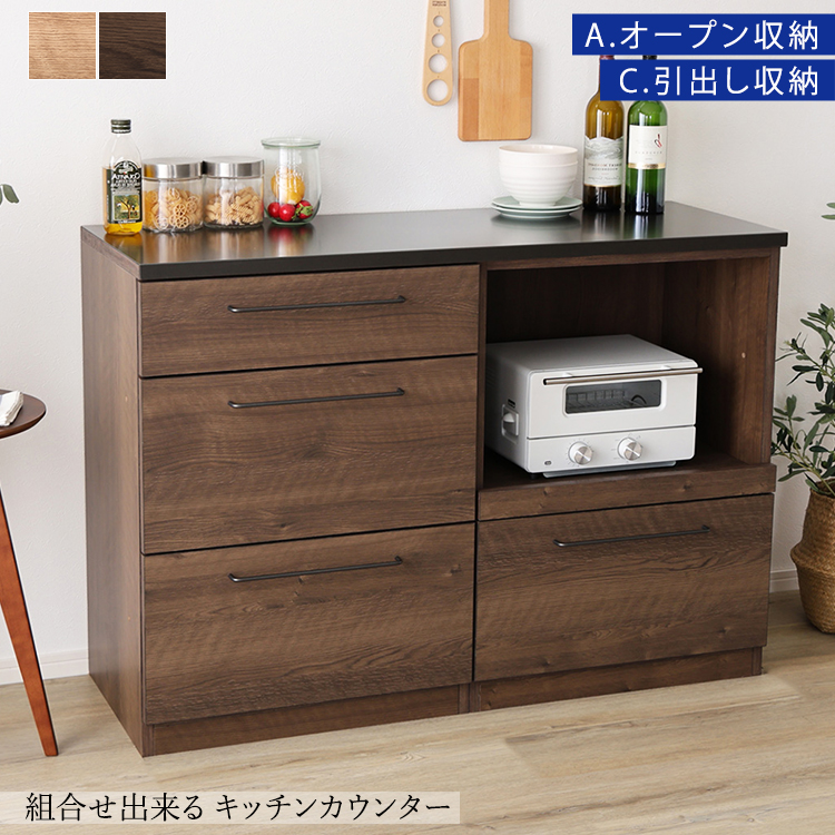 キッチンカウンター LGO 120cm 日本製 木目×スチール 美しく丈夫なブラックトップ (オープン収納+引き出し収納)