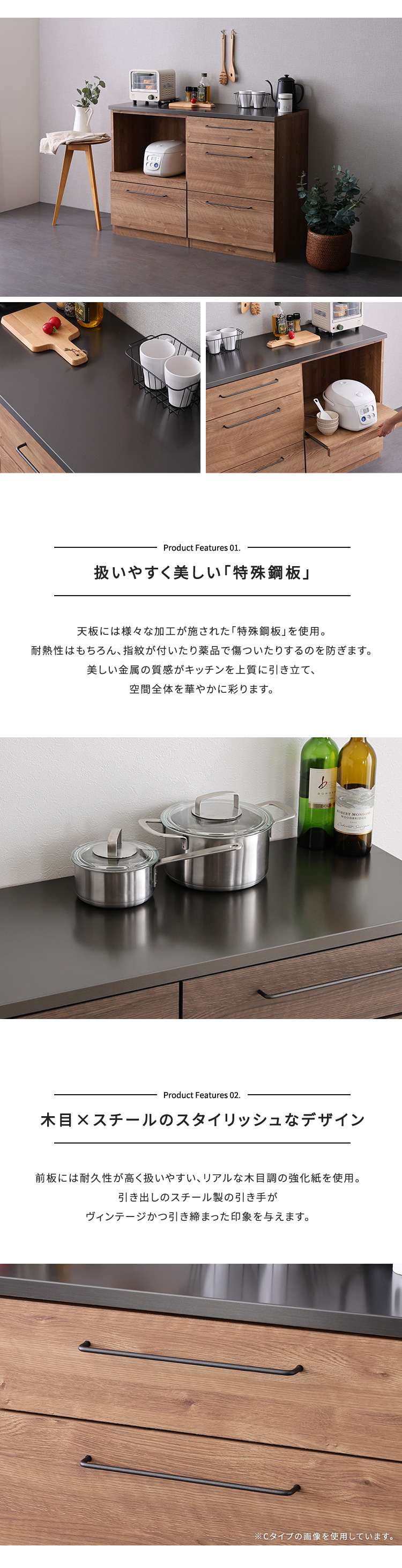 天板には特殊鋼板を使用、耐熱性はもちろん、指紋が目立たず薬品で傷ついたりするのを防ぎます。