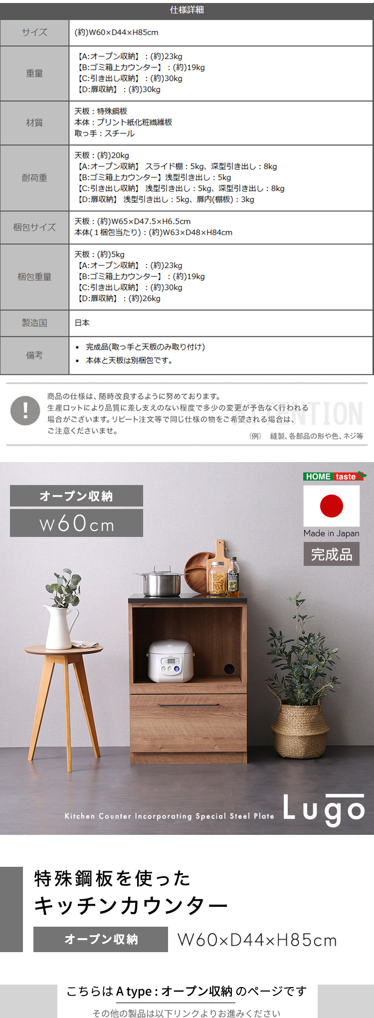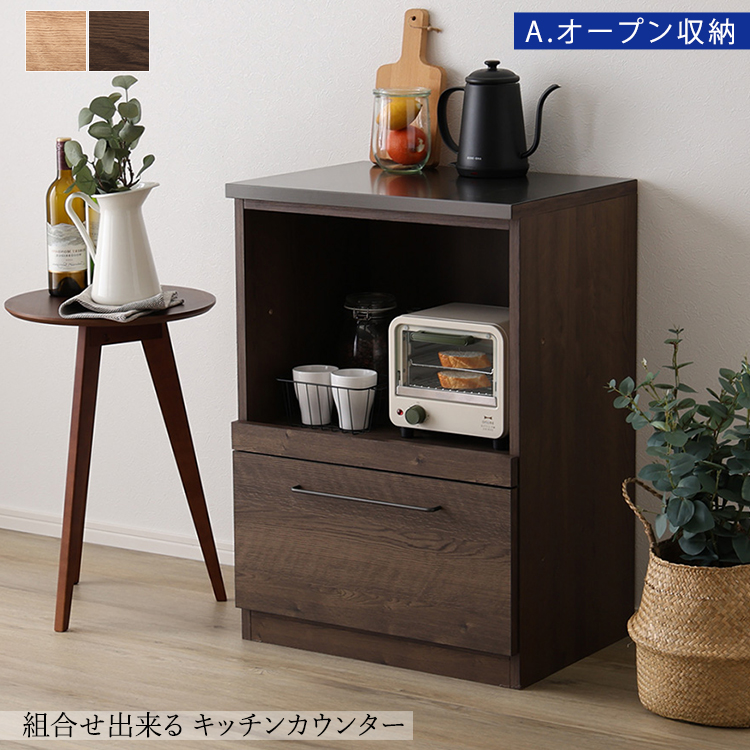 キッチンカウンター LGO 60cm 日本製 木目×スチール 美しく丈夫なブラックトップ (オープン収納)