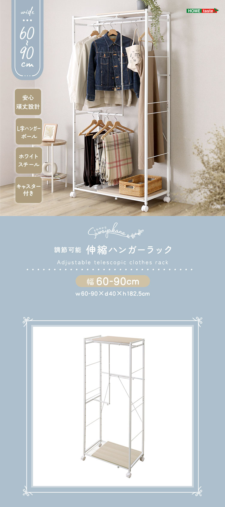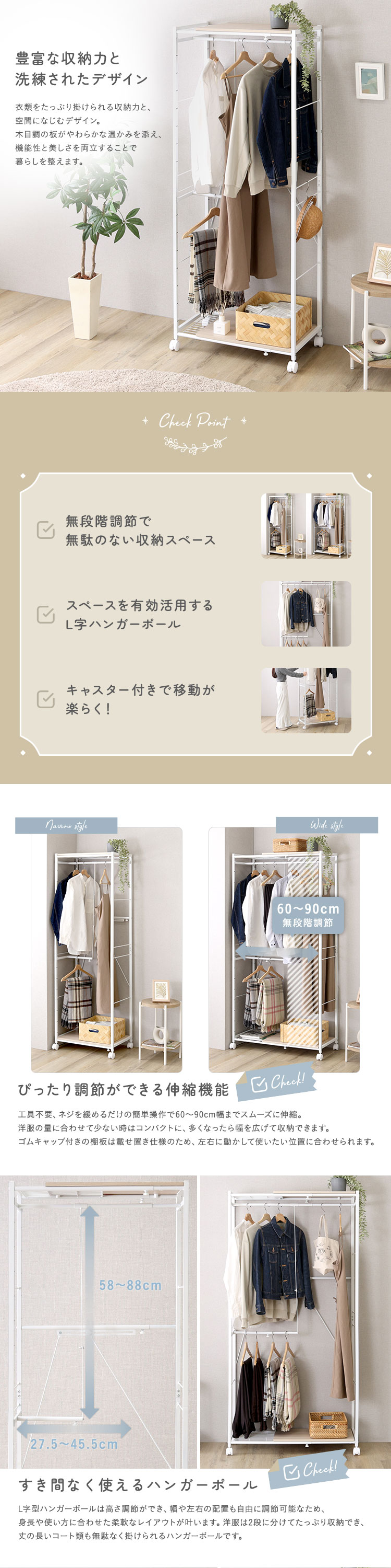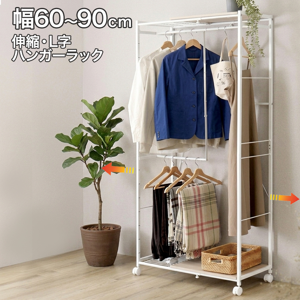 幅伸縮 L字収納 キャスター付きで可動式収納 ハンガーラック