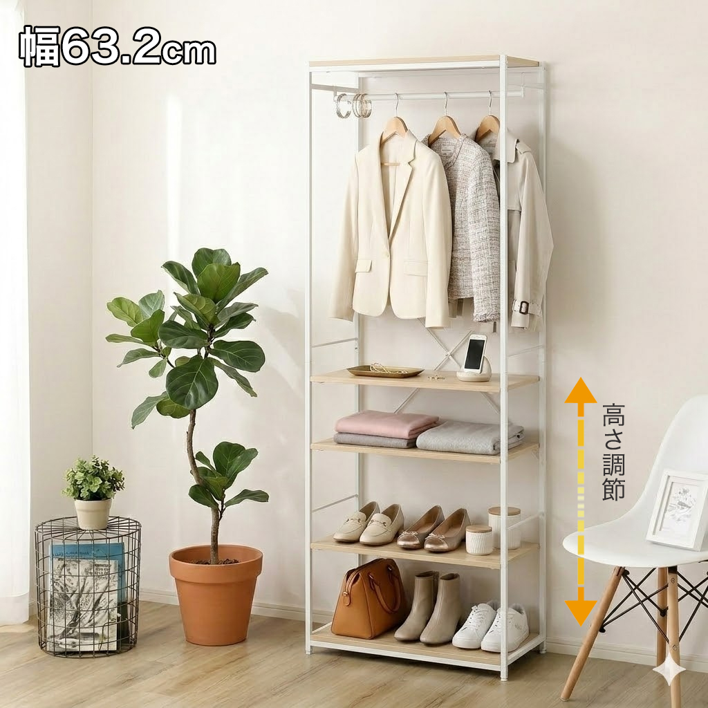 ハンガーラック シューズラック付き 幅63cm 衣類収納ラック コート掛け 玄関収納 高さ調節 棚付き ホワイトスチール 木目ナチュラル 頑丈 省スペース 清潔感