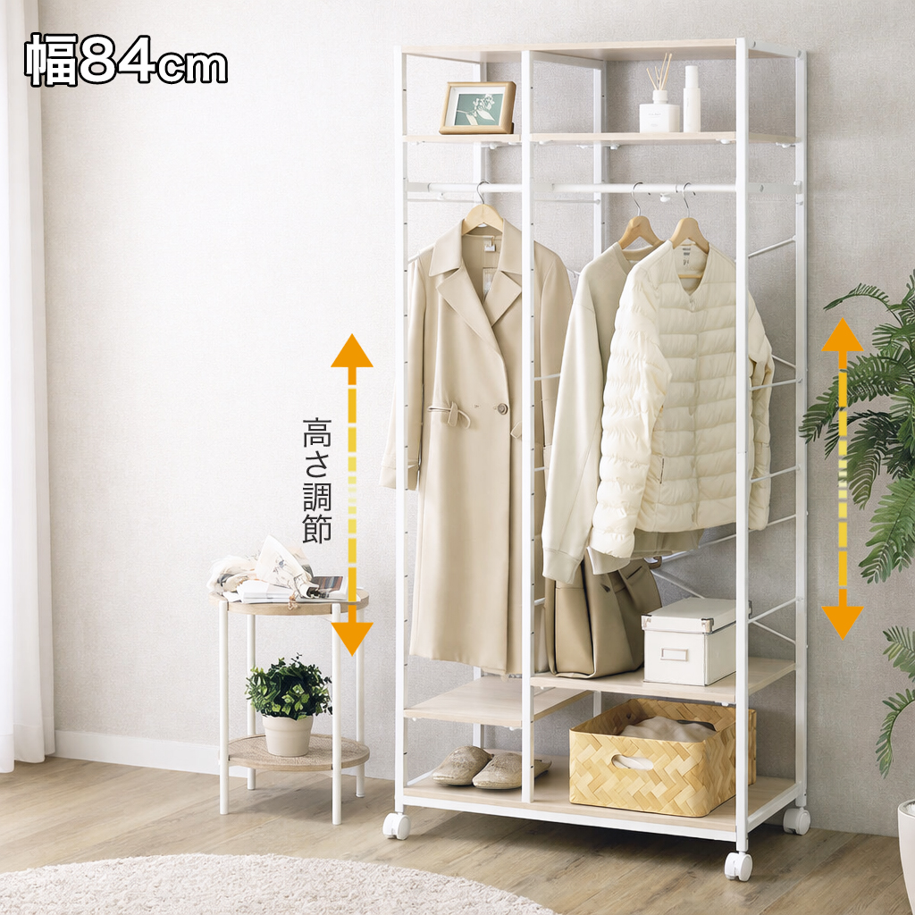 ハンガーラック 2連 幅84cm ダブルハンガーラック 洋服ラック コート掛け キャスター付き 高さ調節 ホワイトスチール 木目調ナチュラル 収納棚付き 頑丈 清潔感