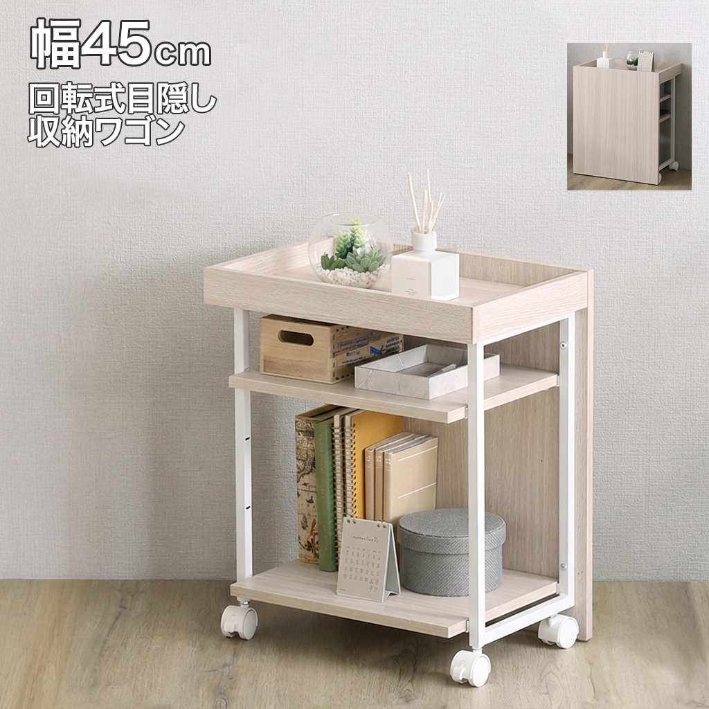 ワゴン 回転式 収納 目隠しワゴン キャスター付き キッチンワゴン サイドワゴン サイドテーブル 可動棚 幅45cm スリム 省スペース リビング 北欧モダン