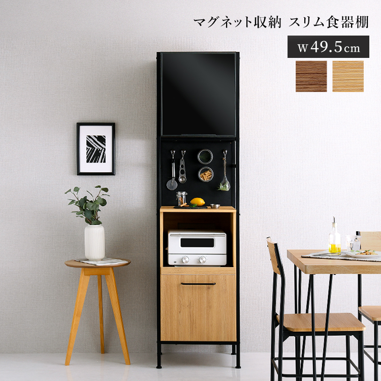 食器棚 キッチンボード スリム 幅50cm マグネット収納 ブラックガラス 木目調 スライドテーブル レンジ台 GECK ヴィンテージ調 ブラウン ナチュラル