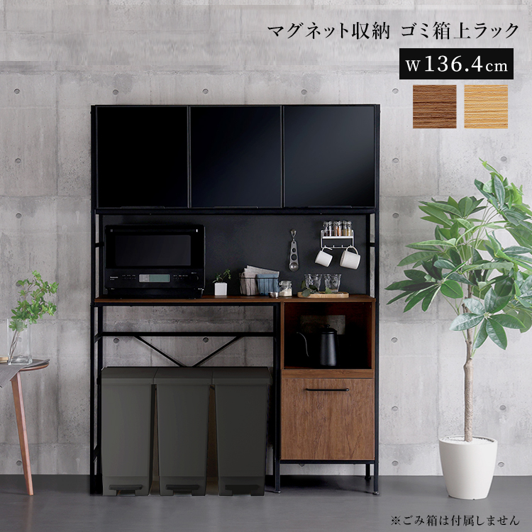 レンジ台 ごみ箱上ラック 幅136cm マグネット収納 ブラックガラス 木目調 食器棚 キッチンラック レンジ台 GECK ヴィンテージ調 ブラウン ナチュラル