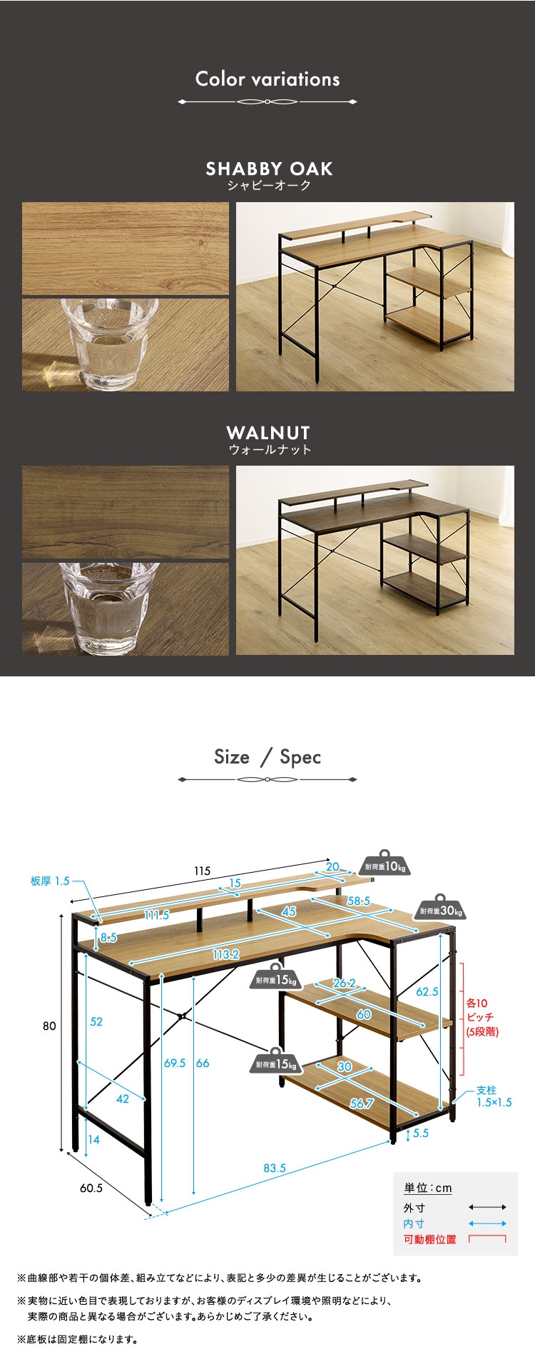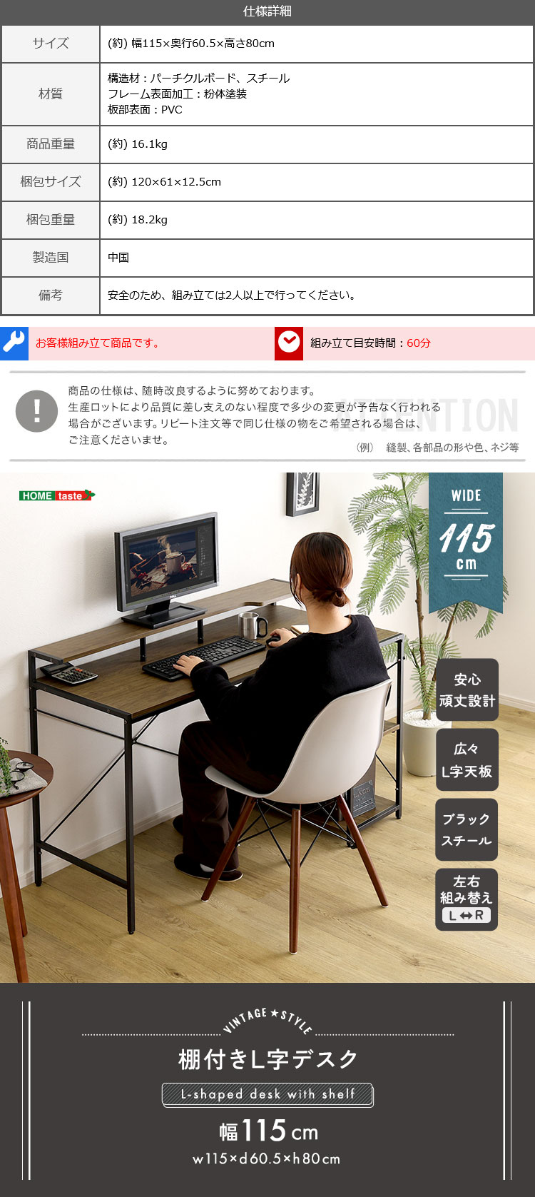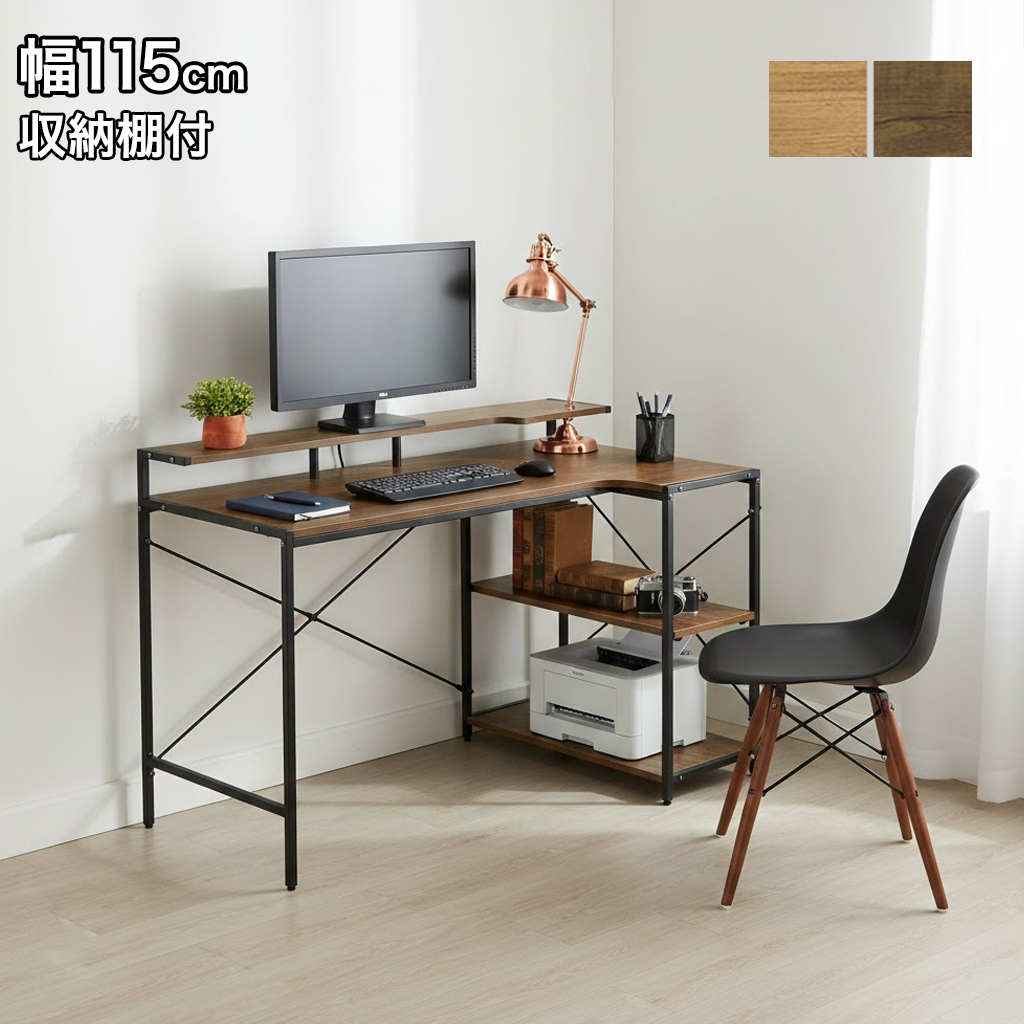 L字デスク 棚付き 左右組替え 幅115cm パソコンデスク 在宅ワーク 学習机 収納付き コーナーデスク ヴィンテージ調 ブラウン 省スペース 頑丈設計