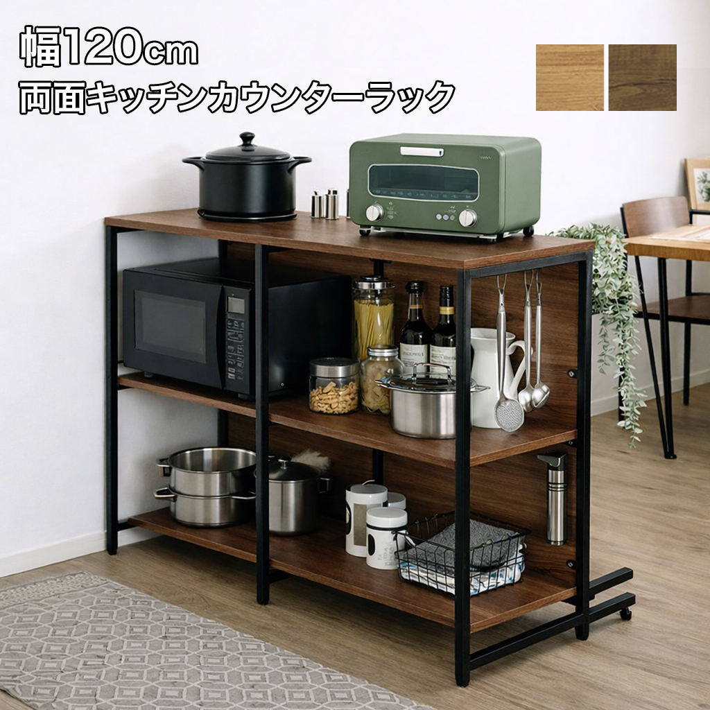 キッチンカウンター 幅120cm キッチンラック 両面収納 カウンターラック キッチン収納 作業台 間仕切り 家電ラック 可動棚 オープンラック ヴィンテージ調