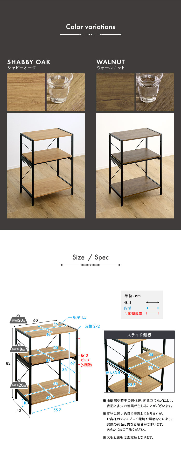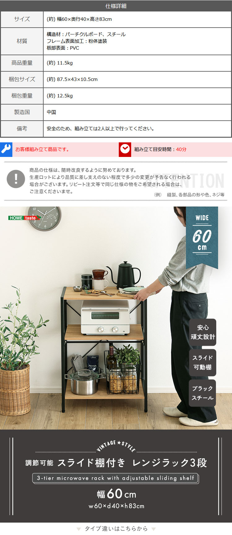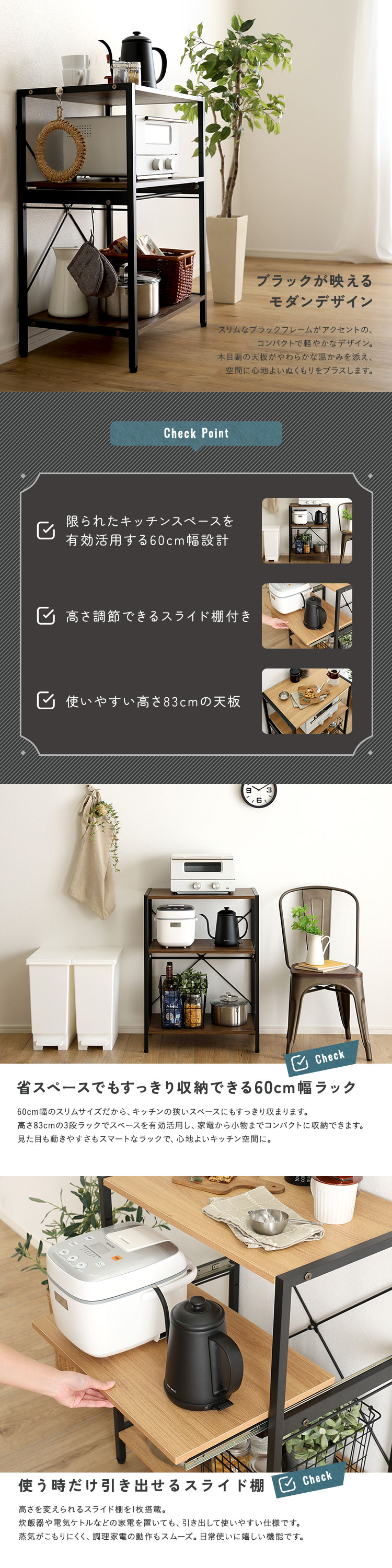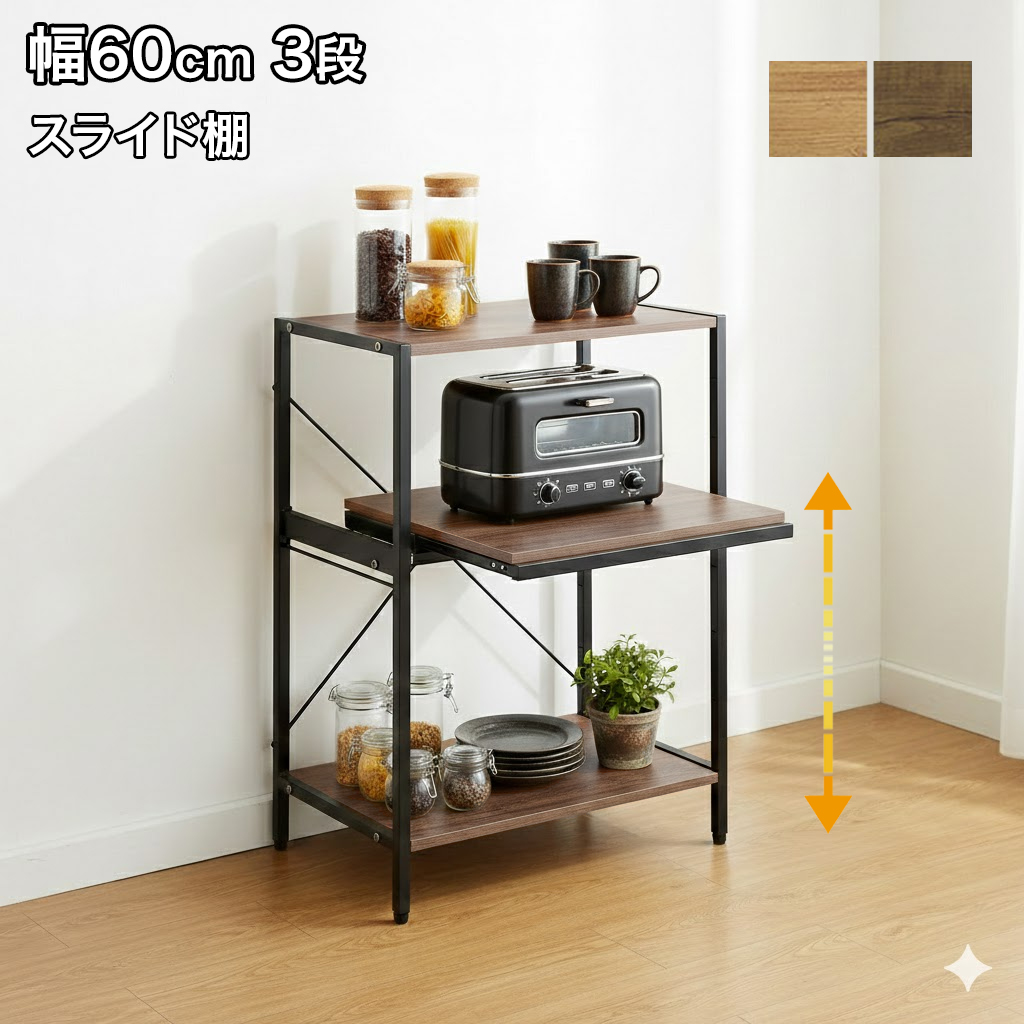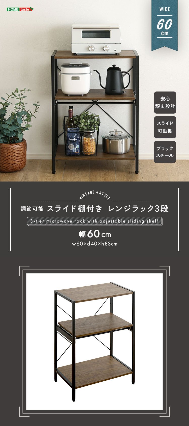 幅60cmの省スペース設計で家電をスッキリ収納できる、スライド棚付き3段ヴィンテージレンジラックです。