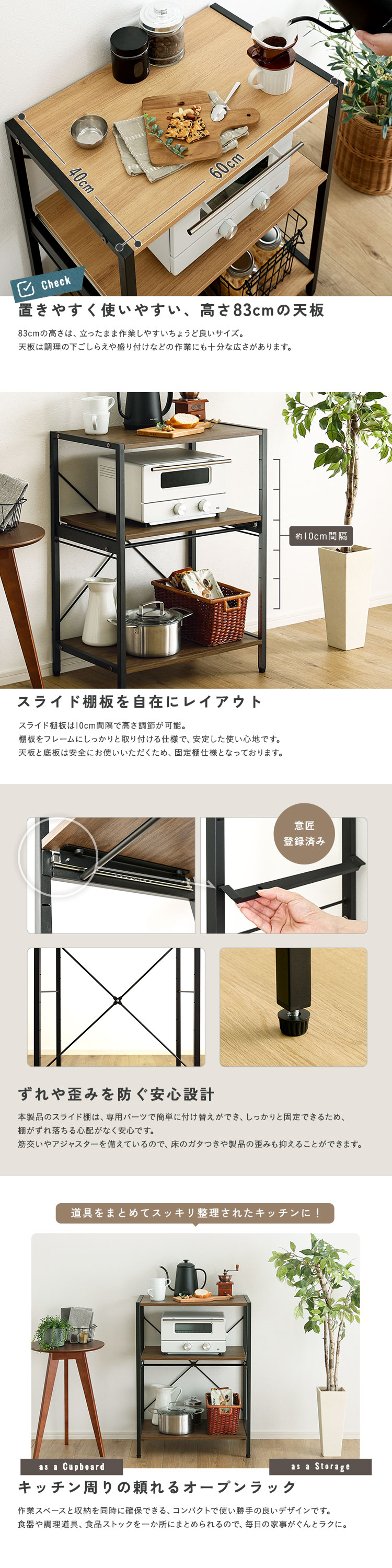 レンジ台 幅60cm 3段 レンジラック スライド棚 キッチンラック キッチンボード 収納 棚 おしゃれ 木目 ブラウン ヴィンテージ アイアン スリム 収納ラック 北欧