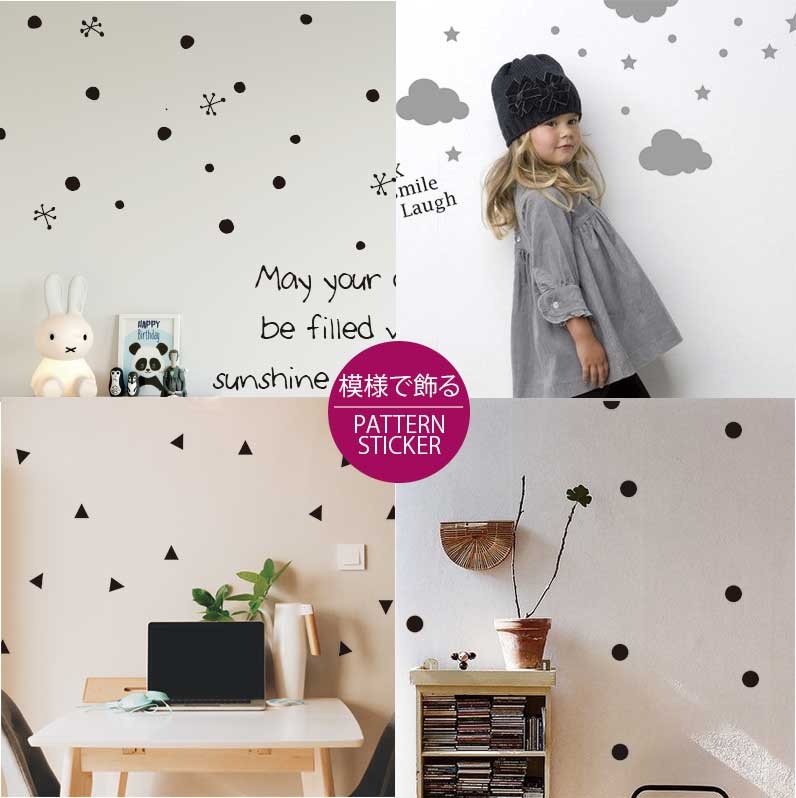 ROOM*PLUS考案のパターン柄のウォールステッカーは北欧っぽい素敵な壁紙が完成する模様のウォールステッカー(インテリアシール/壁シール)。転写式と同じようにカラーシートをカッティングして作ったアイテムなので施工も簡単で仕上がりは抜群!シール感がなくまるでそんな模様だったかのようなおしゃれな雰囲気に!水玉(ドット)、星(スター)、三角、さくらんぼ、お魚などなど。あっという間に外国のお部屋のようなかわいいリフォームができてしまいます。一人でも簡単に貼ってはがせるので気軽に模様替えできるDIYステッカー。一人暮らしからファミリーまで壁を飾って楽しむそれが「パターンステッカー」です。おしゃれで可愛く、大人かわいいまでカバーできる素敵な魅力がいっぱいです。カラフルなキュートな子供部屋にしたり、モノトーンの落ち着いたトイレコーディネートにしたり、小さいお子様に好評の身長計(growup)に合わせて雲やしずくなどで飾ったりアイデアの幅は無限に広がります。また、パーティーなどのイベントの飾り付けもオリジナリティあふれる楽しい空間を作れ、汚れ・傷隠しにも最適です。