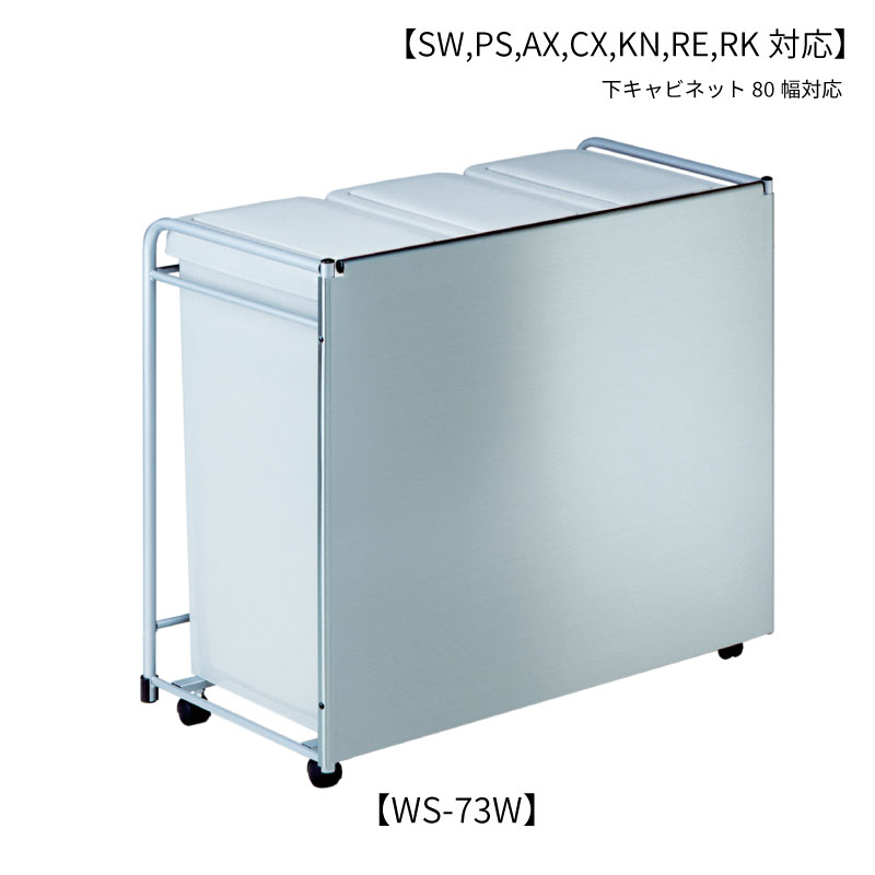 商品サイズ:小 【サイズ】幅736×奥行380×高さ621(mm) ダストボックスワゴン(ダストボックス付) SW、PS、AX、CX、KN、RE、RK対応 下キャビネット80幅対応 3連タイプ 32Lダストボックス3個付き 家具に収納する際はステンレスのパネル面を前にしてください。 下キャビネットのオープン部分にすっきり収納。 キャスター付きなので使う場所に簡単に移動できて便利です。 かさばるペットボトル、空き缶などをらくらく分別。 ダストボックスは、片手で簡単にフタが開くワンプッシュ式。