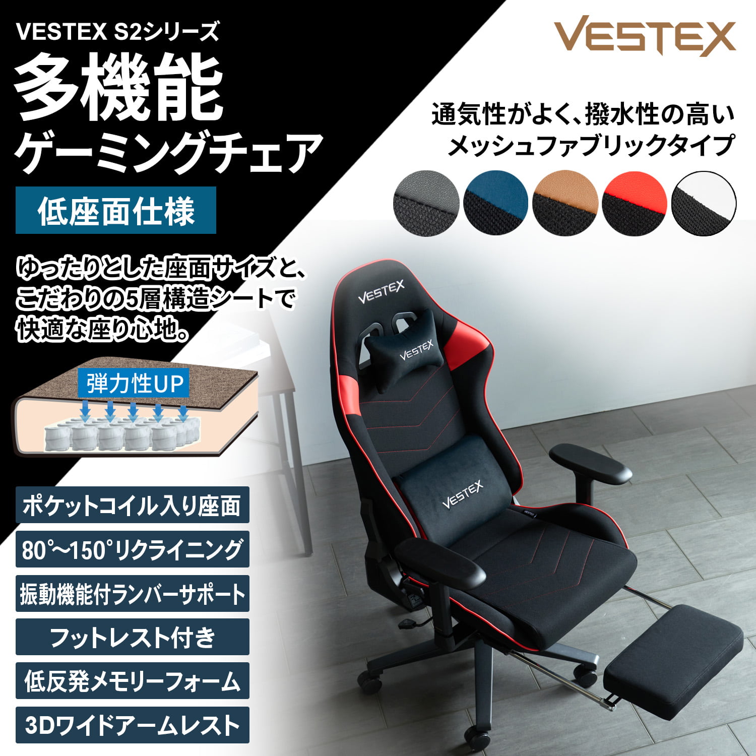フットレスト付き ゲーミングチェア デスクチェア VESTEX S2 高撥水メッシュファブリック ポケットコイル 前傾姿勢 低座面 VES-S2FT