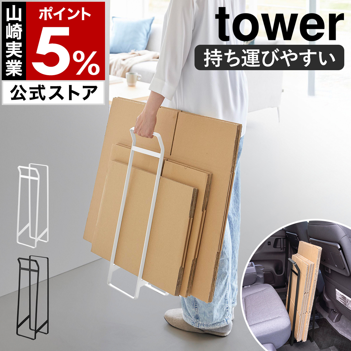 特典付[ 持ち運べるダンボールストッカー タワー スリム ]山崎実業 tower 一時 置き 収納 保管 ラック 移動 yamazaki 公式 ブラック ホワイト 10589 10590