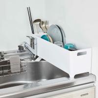 『 tower( タワー )スリム水切りバスケット ロング 』はキッチンのちょっとしたスペースにも置けるスリムな水切りカゴ。置き場所に合わせて方向が変えられる排水用の水はけが付いているので、シンクに対して縦横どちらでも自在にレイアウト。シンク奥行きが50cm以内ならまたいで置くことも。箸やスプーン、フォークなどがすっきり片付くカトラリーケース付きです。