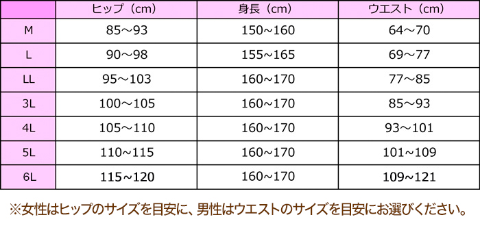 ※女性はヒップのサイズを目安に、男性はウエストのサイズを目安にお選びください。