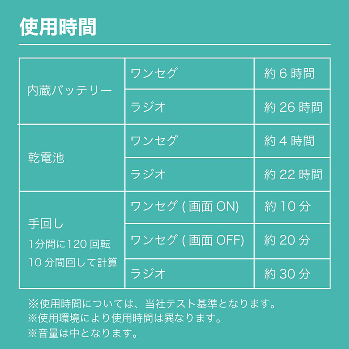 10分間の手回し充電で約30分間ラジオを聞くことができます