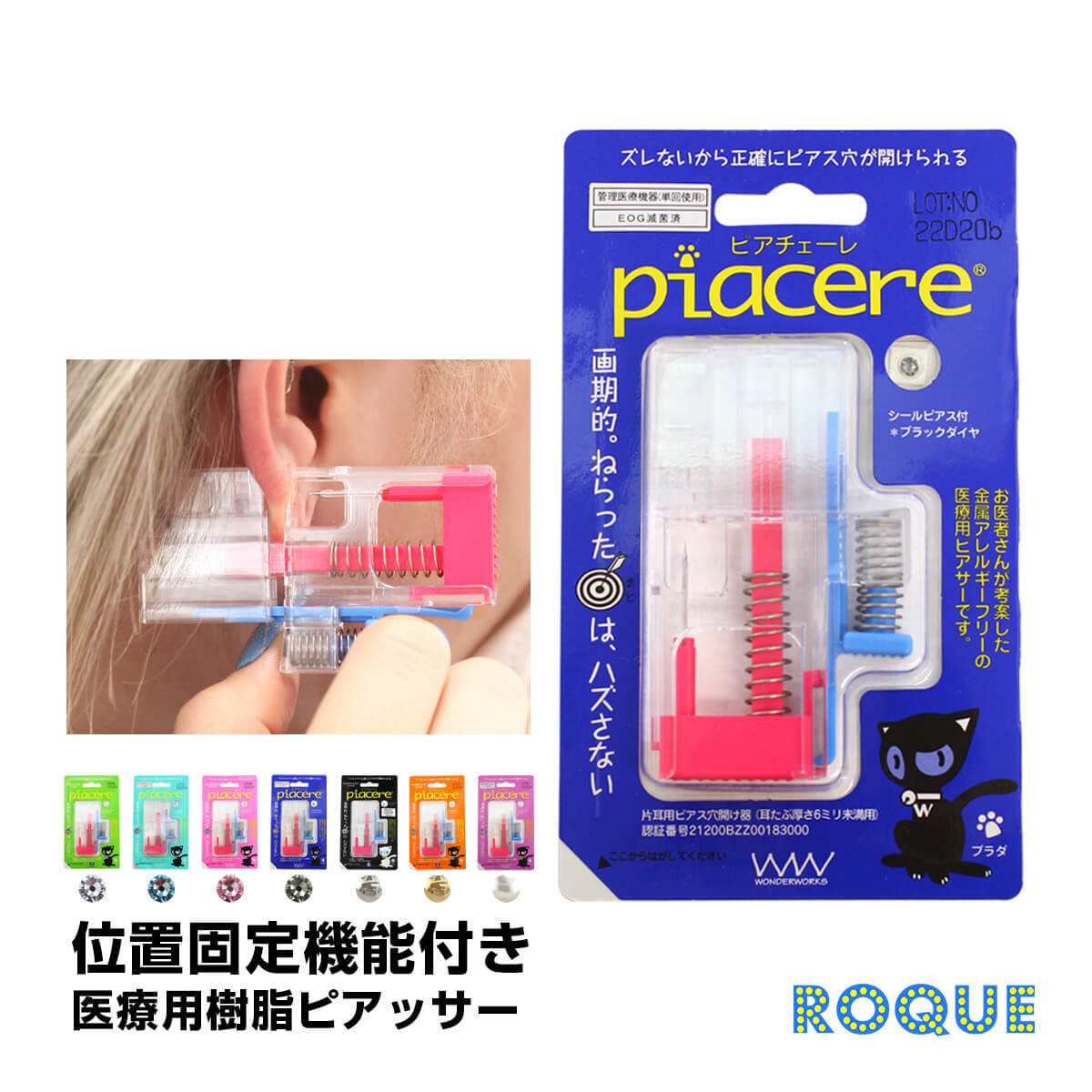 | ズレないから正確にピアス穴が開けられる!「隠す」と「魅せる」を叶えるピアッサー! ■画期的!狙ったまとはハズさない! 耳たぶをしっかり挟むピアッシング位置固定機能やピアッシングの誤射を防ぐ、誤作動防止機能付き ■ピアッシング後の衛生面もしっかり対策! 最後までスライドを押し込むとロックがかかる二度打ち防止機能付き! ■魅せる?隠せる?両方を楽しめるファーストピアス! ファーストピアスは透明のシークレットピアス! 付属のシールピアスを着けてホールを隠す事もおしゃれを楽しむ事もできちゃう! ■ファーストピアスの素材は医療用樹脂製だからお肌に優しい金属アレルギー対応素材! |