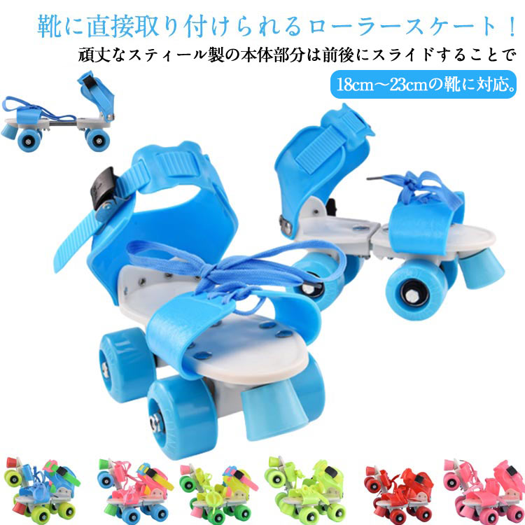 | 靴に直接取り付けられるローラースケート! 頑丈なスティール製の本体部分は前後にスライドすることで18cm〜23cmの靴に対応。 爪先部分は紐でしっかり固定、足首部分はワンタッチで取り外せるストラップ仕様です。 サイズ調節ができるので靴のサイズが変わっても買い換える必要がありません。 調節機構:前後調節は裏面の蝶ネジ、つま先は紐締め、足首部分はラチェット付きストラップ固定 | |