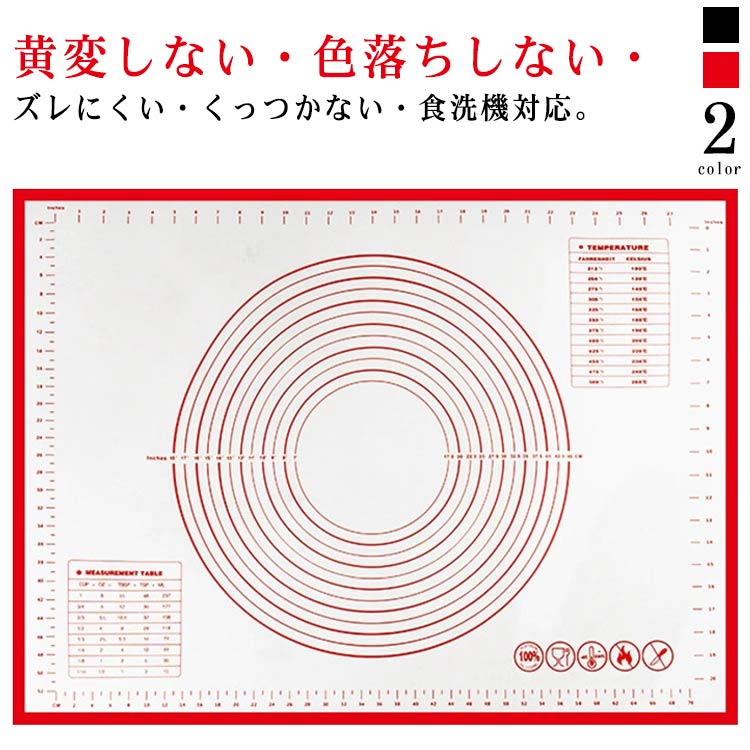 | 黄変しない・色落ちしない・ズレにくい・くっつかない・食洗機対応。 パン・麺・ピザ生地をこねたり伸ばしたりするのに便利なシリコンマット。 裏面は吸着力よく、滑りくく、平らでつるりとしたテーブルや作業台などにピタリと吸着します。ズレにくく生地をこねたり伸ばしたりする作業にぴったり。 引っ張っても形崩れません。丈夫で長持ちできるクッキングシート。 生地がくっつきにくいため、打ち粉も少なくてOK。生地離れがいいので成形もラクラク。 クッキングマットには大きさがわかる目盛りがついているので、生地の大きさをはかる必要もなく、作りながら大きさの確認ができます。 -40°C〜230°Cと幅広い温度帯で使えるので、、オーブンにも電子レンジにも対応でき、揚げ物の油切り、鍋つかみ、鍋敷きなどに幅広くご利用いただけます。 使わない時は折りたたんで収納できるから、スペースを取らず、収納に困りません。 | |