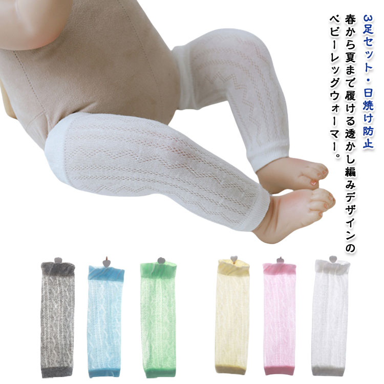 | 春から夏まで履ける透かし編みデザインのベビーレッグウォーマー。 2wayのアームカバーとレッグウォーマー 夏は冷房対策や日焼けなどいろんなシーンで活躍してくれるから重宝します。 レッグカバーだけでなく、アームカバーにも使えます。 ハイハイ時のひざの保護や、外出時の日焼け対策にも♪ 伸縮性抜群で動きやすく、窮屈感なく、ストレスフリー。 洗い替えに便利な子赤ちゃん用レッグウォーマー3足セット。 | |