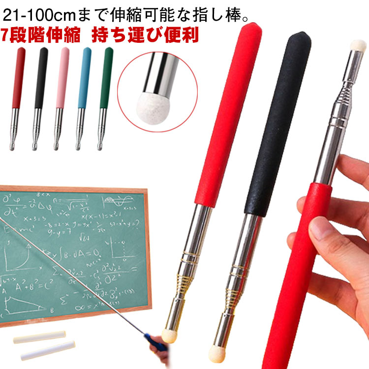| 21-100cmまで伸縮可能な指し棒。 セミナーや会議、学校や塾の授業などでも大活躍の伸縮式指示棒。 先端が柔らかい素材を使用して、黒板やスクリーンにキズをつけません。 軽量なので、授業中や講義中に持ち続けても疲れにくく快適にご使用いただけます。 7段階の伸長が可能で、各関節の機構が固いので自分の好きな長さの場所で止められる。 | |