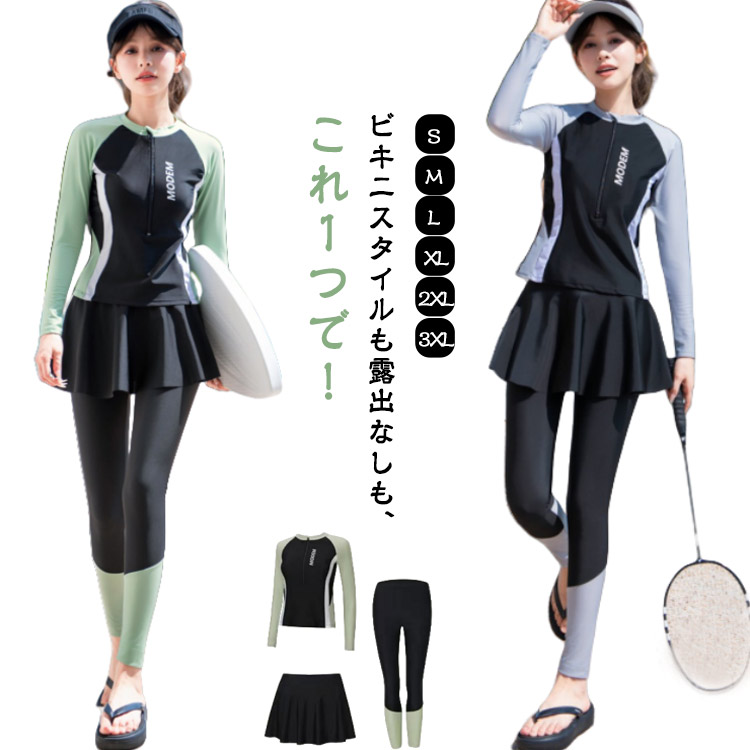 3点セット 水着 ラッシュガード レディース セットアップ UVカット 日焼け防止 長袖 レギンス ママ水着 スカート ハーフジップ ストレッチ 体型