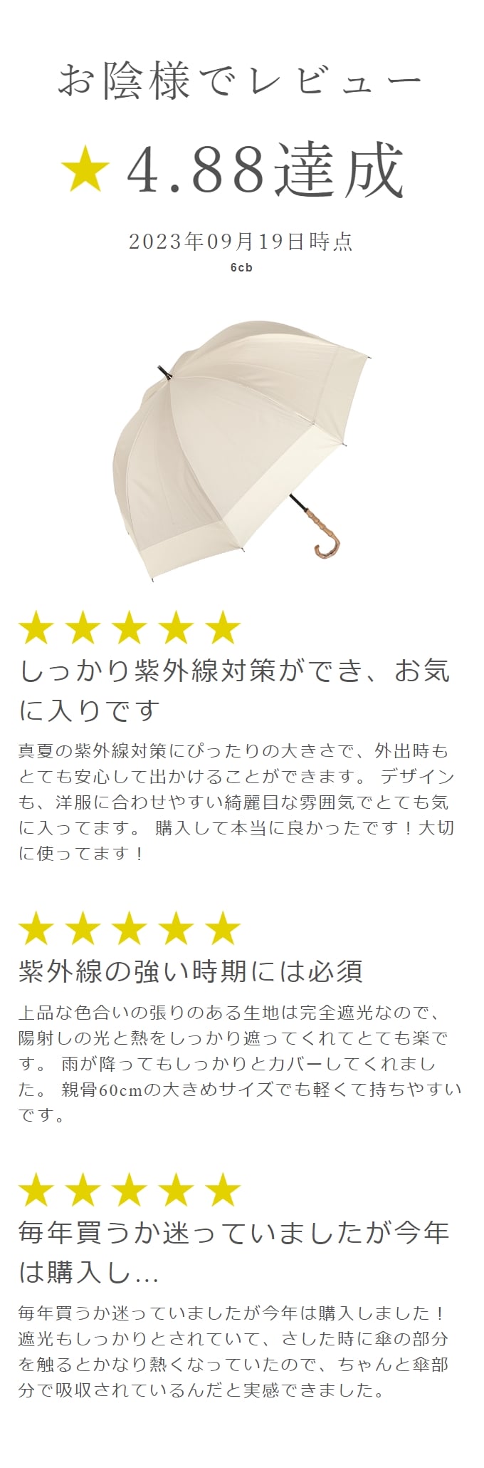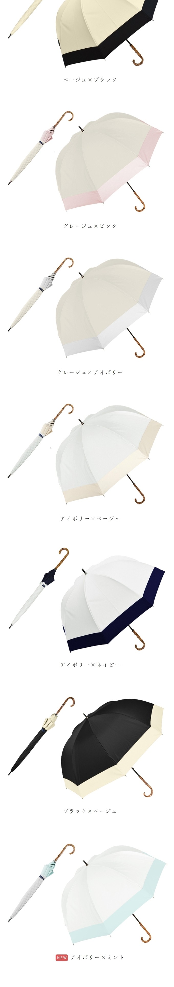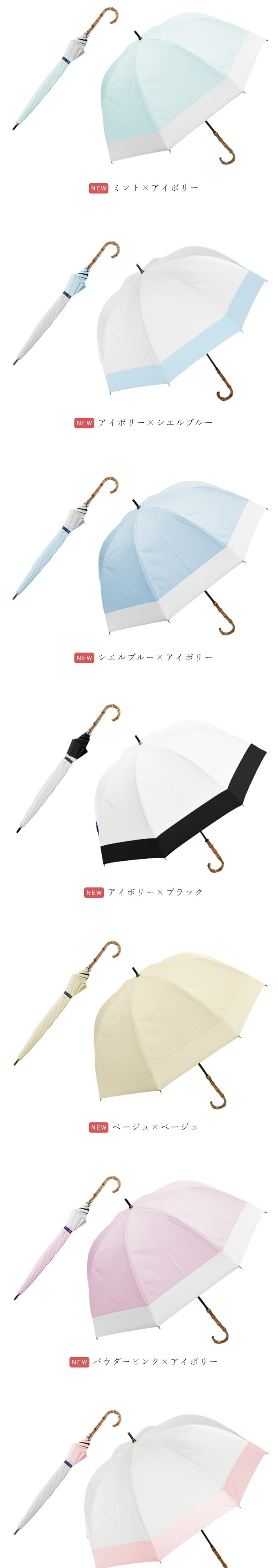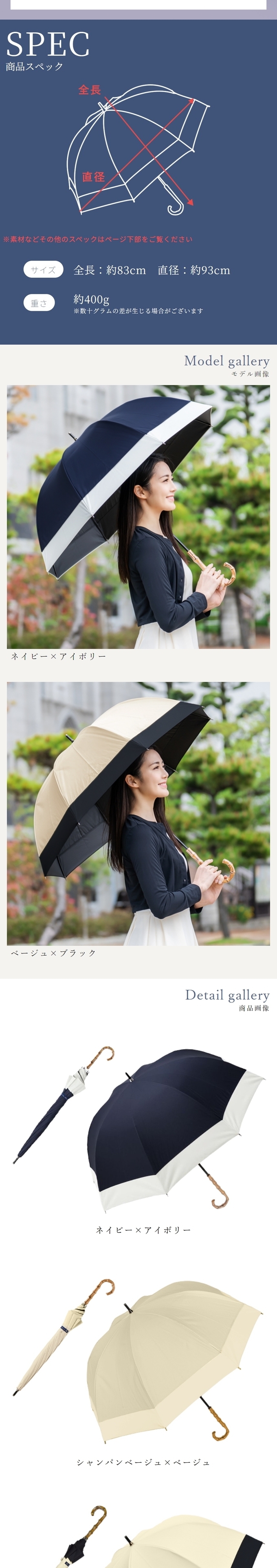 | ・長傘の中でも大きなサイズ。 ・骨をやや深張りにした丸みあるフォルム。 ・淡色もすべて遮光率100%の試験をクリアで同様に安心の100%遮光。 ・撥水加工で雨の日もご利用可能。 【ご注意】 竹手元を採用している商品につきましては、天然素材のため、色/節の数/デザイン等に個性がございます。濡れた後は回転させて水滴を飛ばさず、タオル等で雨粒を拭き取り、陰干ししてからおしまい下さい。また、強風時や極度の強雨の場合はご使用をお控え下さい。生地を骨に挟まないよう開閉ください。自転車/ベビーカー等に固定したり、ステッキとしてのご使用は危険ですのでおやめください。ハンドクリームや日焼け止めクリーム等が本製品の生地・手元等の色落ちの原因になる場合がありますのでご注意下さい。 ※初期不良の受付はご利用前に限ります。初期不良とはご使用になられる前の、初回開封時に認められる不具合の事です。商品画像と実物には色の差がある場合がございます。ご了承の上ご購入下さい。物流システムの関係上、ご注文後の商品変更・キャンセルはご遠慮ください。 | スペック |