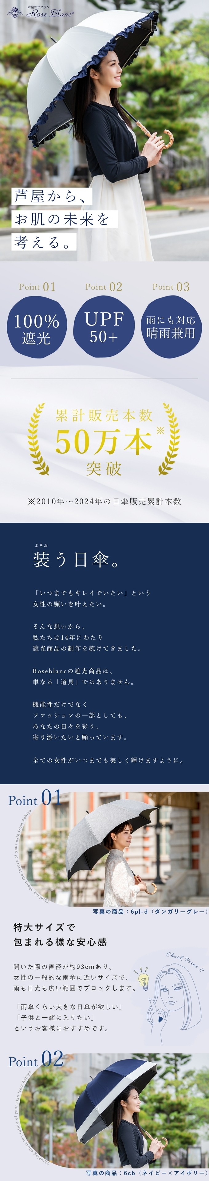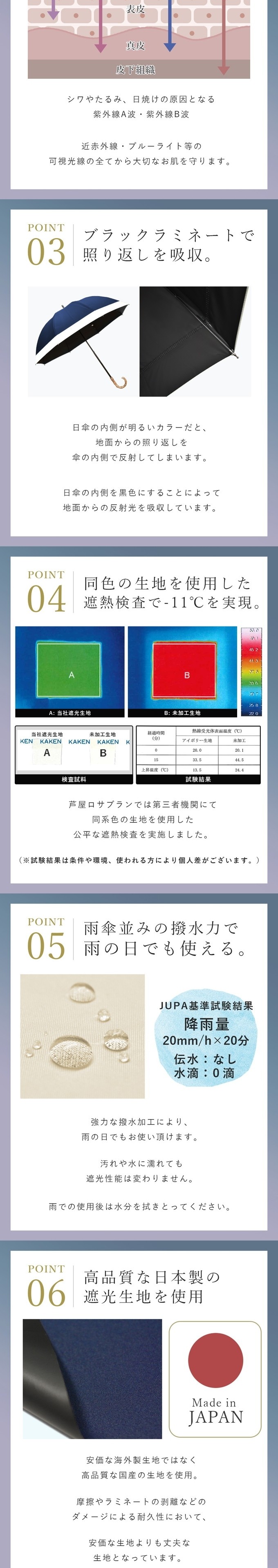 遮光にこだわりぬいた日本製生地 低コストの海外製加工生地では例え検査機関の証明が出たとしても、生地全体として安定した遮光率を維持することに限界があり、当社は日本製の加工生地を使用しています。 機能性とファッション性を追求 当社で使用している生地は遮光率はもちろんのこと、内側のブラックラミネート加工が照り返しからお肌や眼を守り、お洒落にもこだわっています。濡れたり汚れたり摩擦しても遮光率は落ちず、生地が破れない限り遮光性能をキープします。 上質かつ上品な色出しやバリエーションは、紫外線対策をしながらファッションも楽しんでいただけるようにデザインしています。 また、より遮光することを意識した深張りがデザイン的にも大好評です。 海外からのご注文も増加! 海外在住の邦人の方だけでなく、多くの外国人の方からもご注文をいただいており、ロサブランブランドはワールドワイドにご支持が拡がっています。 | 品質とご理解いただきたい点 |